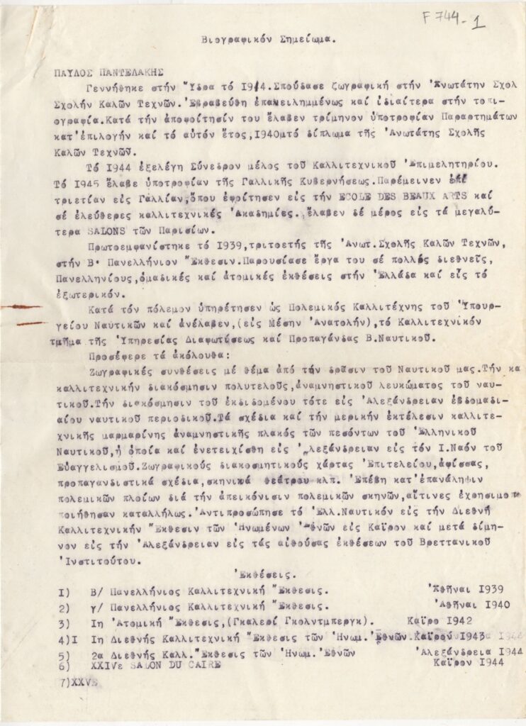 Βιογραφικό, δακτυλόγραφο, χαρτί, 3 φφ, 29×21 εκ., στα ελληνικά, του Παύλου Παντελάκη. Περιέχει σπουδές, μετακινήσεις, εκθέσεις, λίστα αγοραστών των έργων του και κυριώτερα έργα του.