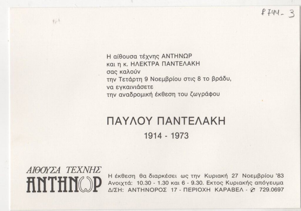 Πρόσκληση, χαρτόνι, 12×17,5 εκ., στα ελληνικά, εγκαινίων αναδρομικής έκθεσης του Παύλου Παντελάκη.