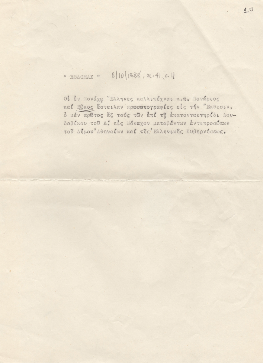 Αποδελτίωση, δακτυλόγραφο, χαρτί, 29×21 εκ., στα ελληνικά, άρθρου για τον Κωνσταντίνο Πανώριο.