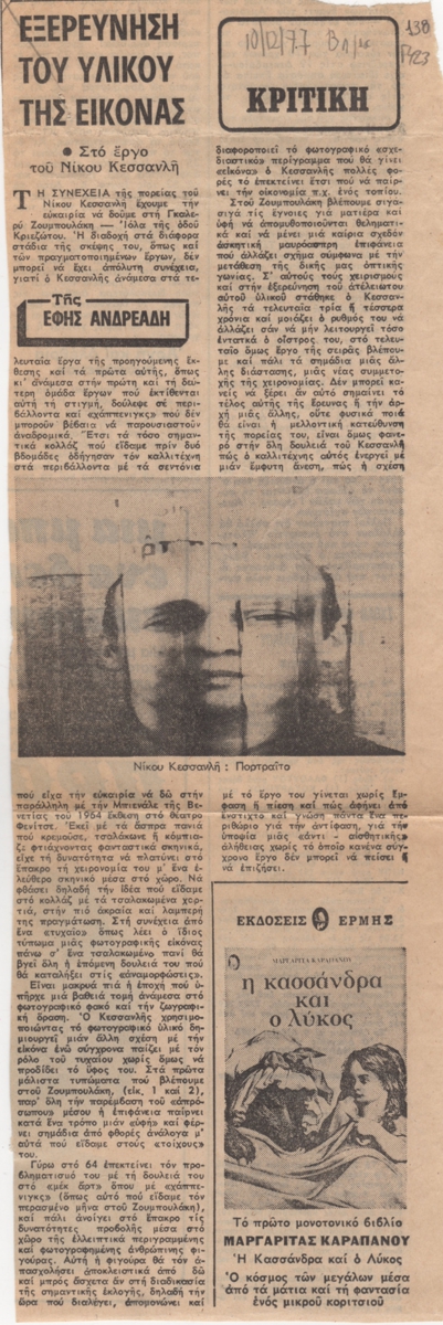 Απόκομμα, χαρτί, 33×11 εκ., στα ελληνικά, δημοσίευσης κριτικής έκθεσης του Νίκου Κεσσανλή, η οποία διεξάγεται στην γκαλερί Ιόλα Ζουμπουλάκη στην Αθήνα. Το κείμενο εντάσσεται στην ομώνυμη στήλη “Κριτική” του εντύπου.