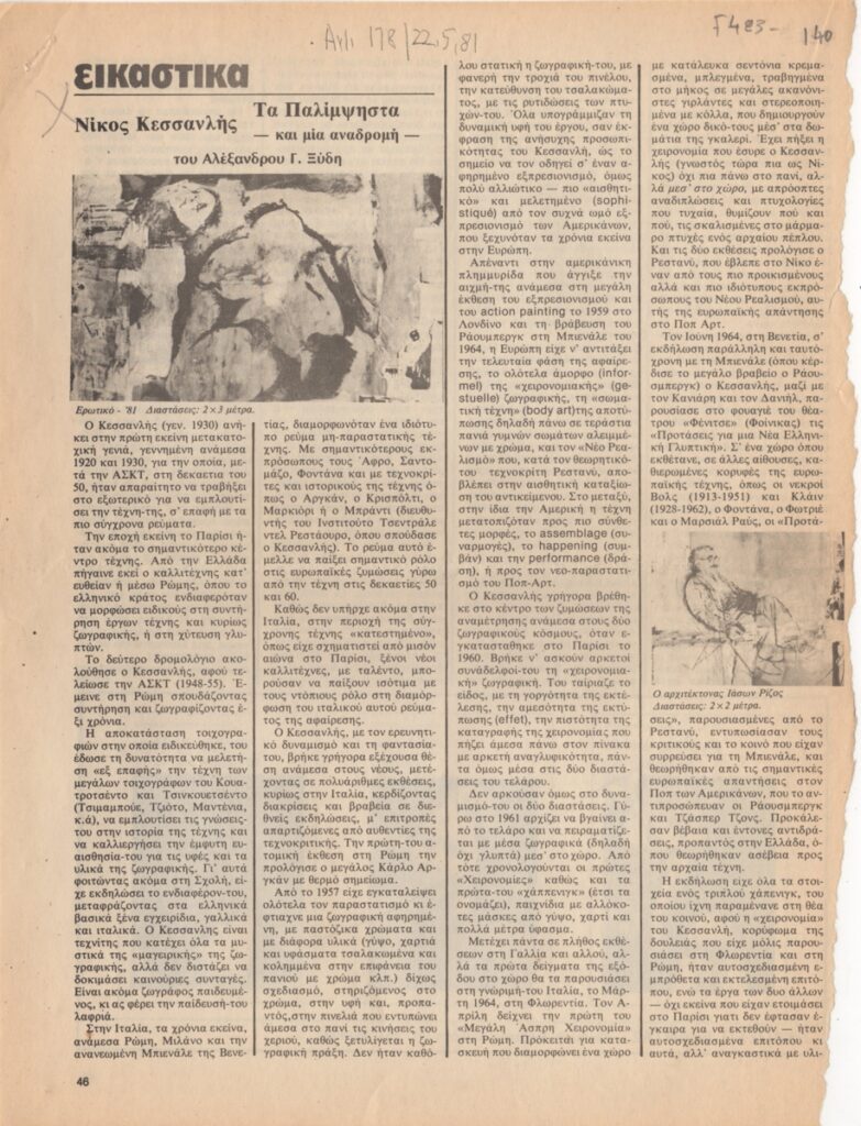 Απόκομμα, χαρτί, 27.5×21 εκ., στα ελληνικά, δημοσίευσης κριτικής έκθεσης του Νίκου Κεσσανλή, η οποία διεξάγεται στην Αίθουσα Τέχνης Δεσμός. Στο ίδιο, σχολιάζεται ευρύτερα το εικαστικό του έργο.
