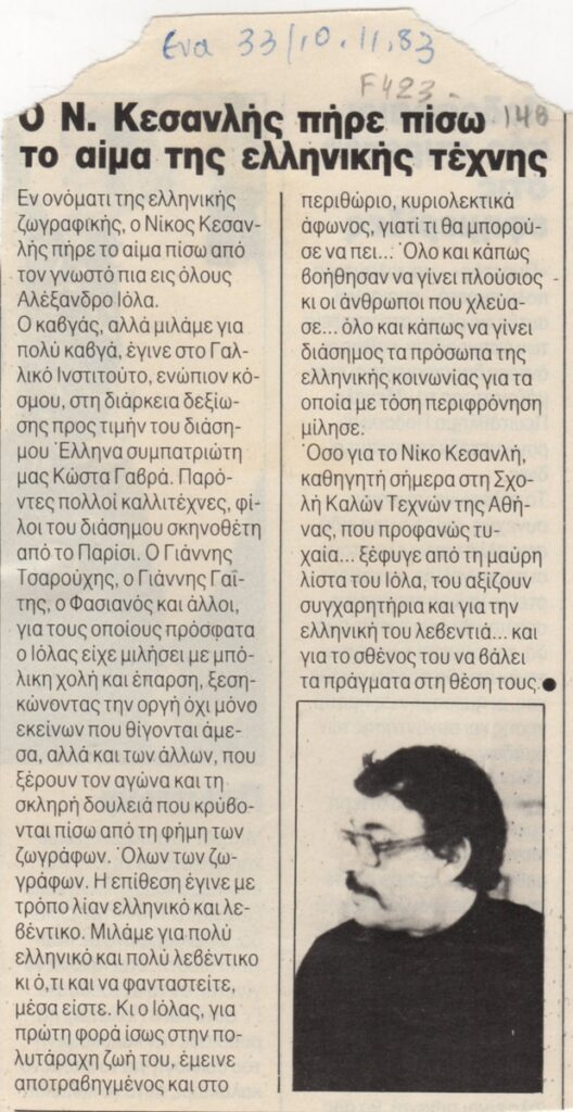 Απόκομμα, χαρτί, 16×8,5 εκ., στα ελληνικά, δημοσίευσης άρθρου που αναφέρεται σε καυγά ανάμεσα στους Νίκο Κεσσανλή και Αλέξανδρο Ιόλα. Το απόκομμα εικονογραφείται και φέρει επιγραφές.