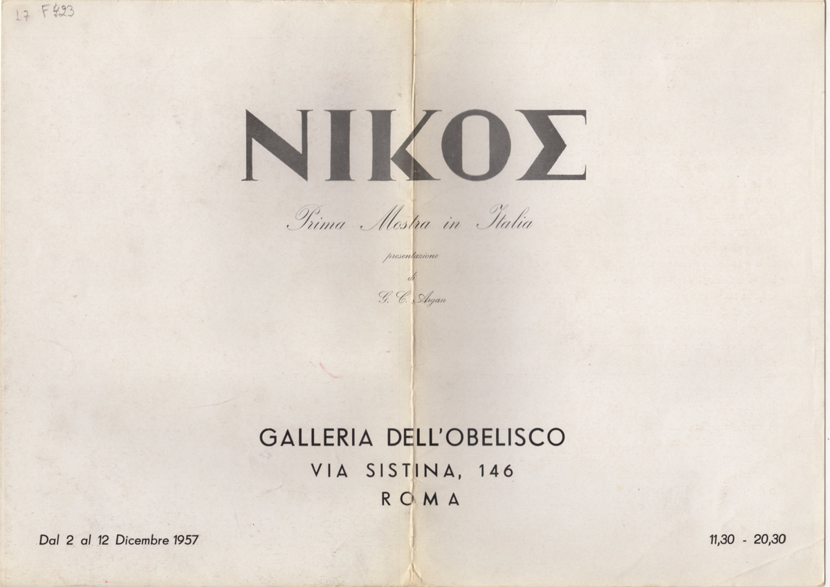 Έντυπο και πρόσκληση, χαρτόνι, 2 φφ, 25×35 εκ., στα ιταλικά, ατομικής έκθεσης του Νίκου Κεσσανλή. Το έντυπο περιέχει βιογραφικό του καλλιτέχνη, κείμενο για το έργο που παρουσιάζεται και εικονογράφηση.