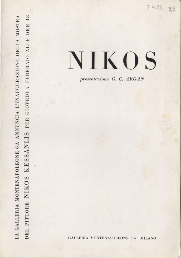 Έντυπο, χαρτί αναδιπλωμένο, 24,5×17 εκ., στα γαλλικά, ατομικής έκθεσης ζωγραφικής του Νίκου Κεσσανλή. Περιέχει κείμενο/κριτική του Giulio Carlo Argan για το έργο που παρουσιάζεται, βιογραφικό σημείωμα και εικονογράφηση.