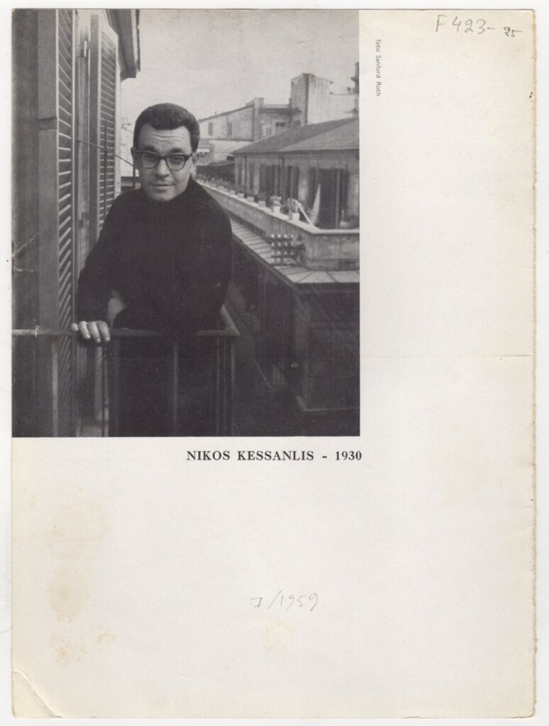Απόκομμα, χαρτί ιλλουστρασιόν διπλής όψης, 24.5×18 εκ., στα ελληνικά και ιταλικά, ατομικής έκθεσης του Νίκου Κεσσανλή. Το έντυπο εικονογραφείται.