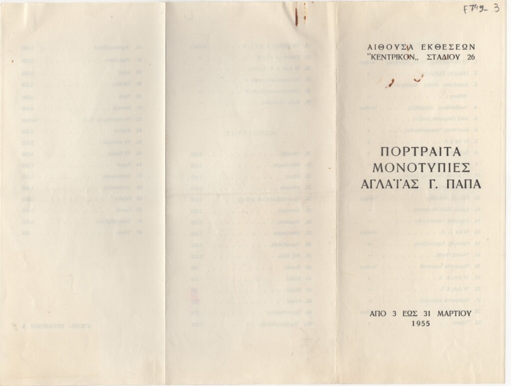 Τιμοκατάλογος, χαρτί δίπτυχο, 23×10 εκ., στα ελληνικά, έργων ατομικής έκθεσης της Αγλαΐας Παπά.