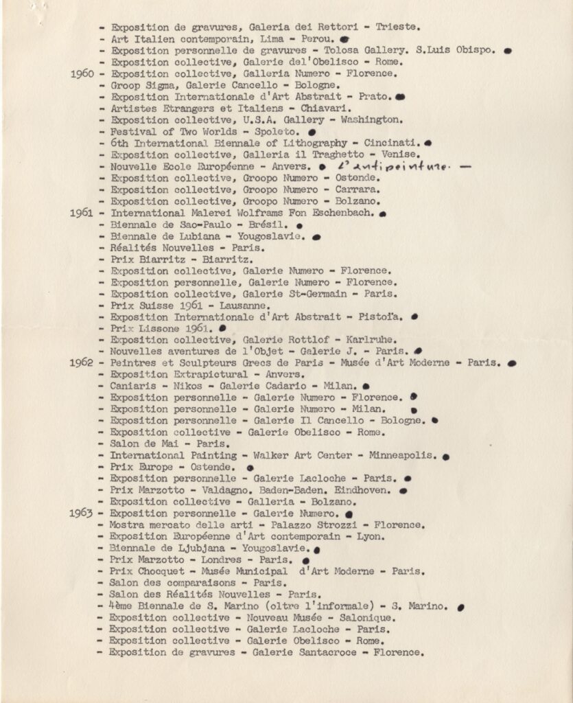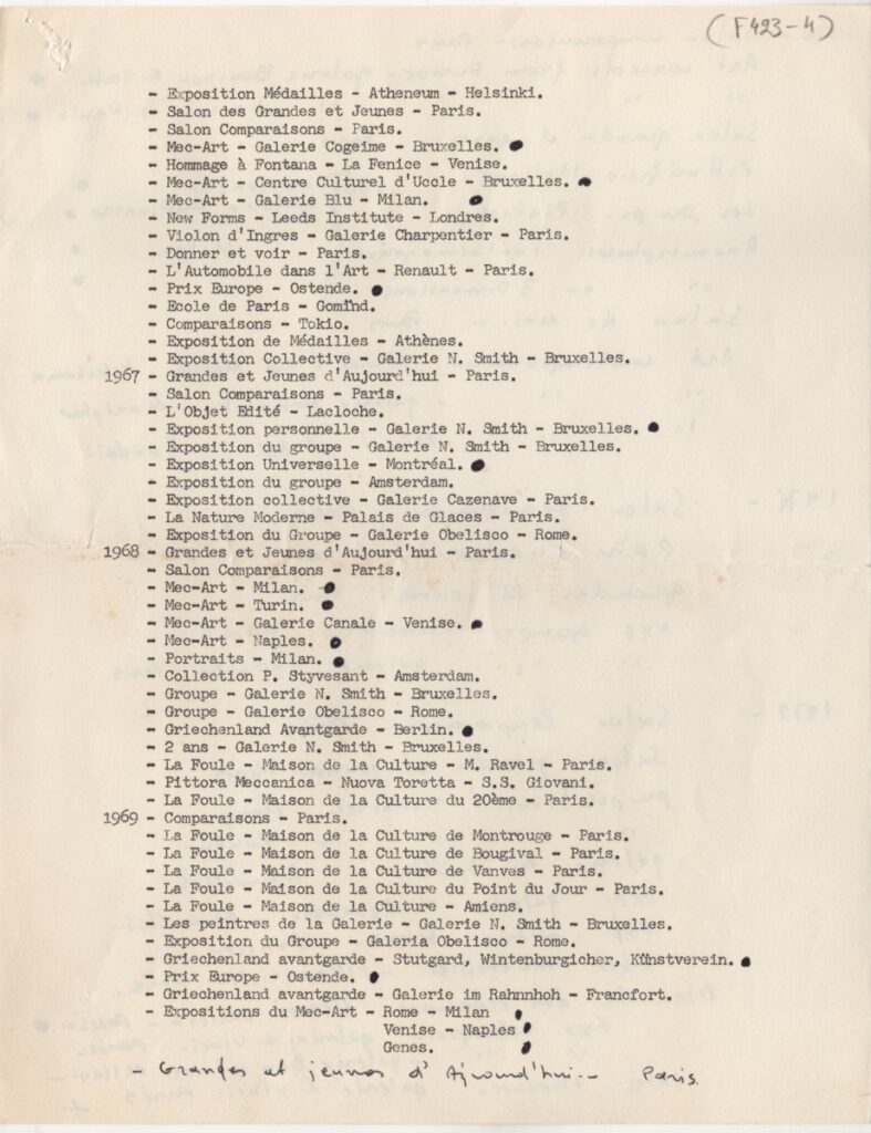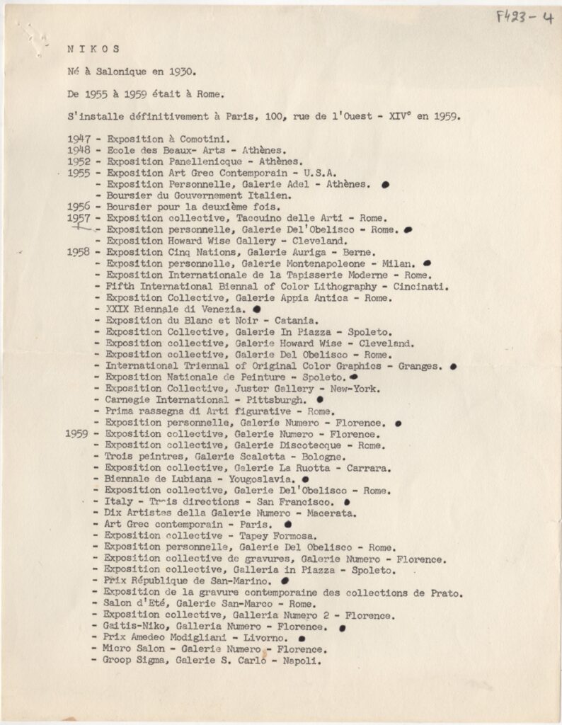 Βιογραφικό, δακτυλόγραφο, χαρτί, 5 φφ, στα γαλλικά, 27×21 εκ., του Νίκου Κεσσανλή. Περιέχει λίστα εκθέσεων του καλλιτέχνη.