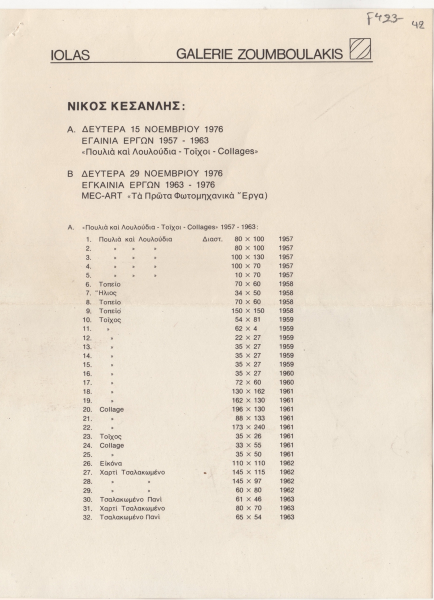 Κατάλογος, χαρτί, 2 φφ, 28,5×21 εκ., στα ελληνικά,έργων εκθέσεων του Νίκου Κεσσανλή, που διεξάγονται στην γκαλερί Ιόλα Ζουμπουλάκη.