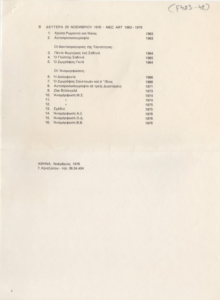 Κώστας Ανδρέου (1917 - 2007) ; Δημήτρης Α. Φατούρος (1928 - 2020) ; Ιωάννα Σπητέρη-Βεροπούλου (1920 - 2000) ; Eugène Delacroix (1798 - 1863) ; Γιώργος Τούγιας (1922 - 1994) ; Γαβριέλλα Σίμωσι (1926 - 1999) ; Κώστας Τσόκλης (1930) ; Γεράσιμος Σκλάβος (1927 - 1967) ; Άγγελος Αγγελόπουλος (1904 - 1995) ; Αλέκος Κοντόπουλος (1904 - 1975) ; Άλεξ Μυλωνά (1923 - 2016) ; Ντίκος Βυζάντιος (1924 - 2007) ; Berto Lardera ; Κώστας Βαλσάμης (1908 - 2003) ; Γιάννης Γαΐτης (1923 - 1984) ; Λε Κορμπιζιέ (1887 - 1965) ; Georges Mathieu (1921 - 2012) ; Θόδωρος (Παπαδημητρίου) (1931 - 2018) ; Τάκις (Βασιλάκης Παναγιώτης) (1925 - 2019) ; Victor Vasarely ; Φιλόλαος (Τλούπας) (1923 - 2010) ; Νίκος Κεσσανλής (1930 - 2004) ; Τίτα Κριεζή (1930 - 2021) ; Αγλαΐα Λυμπεράκη (1923 - 1985) ; Γιάννης Μαλτέζος (1915 - 1987) ; Ιάσων Μολφέσης (1925 - 2009) ; Κώστας Πανιάρας (1934 - 2014) ; Κώστας Καρράς (1936 - 2012) ; Γιώργος Βαφειάδης