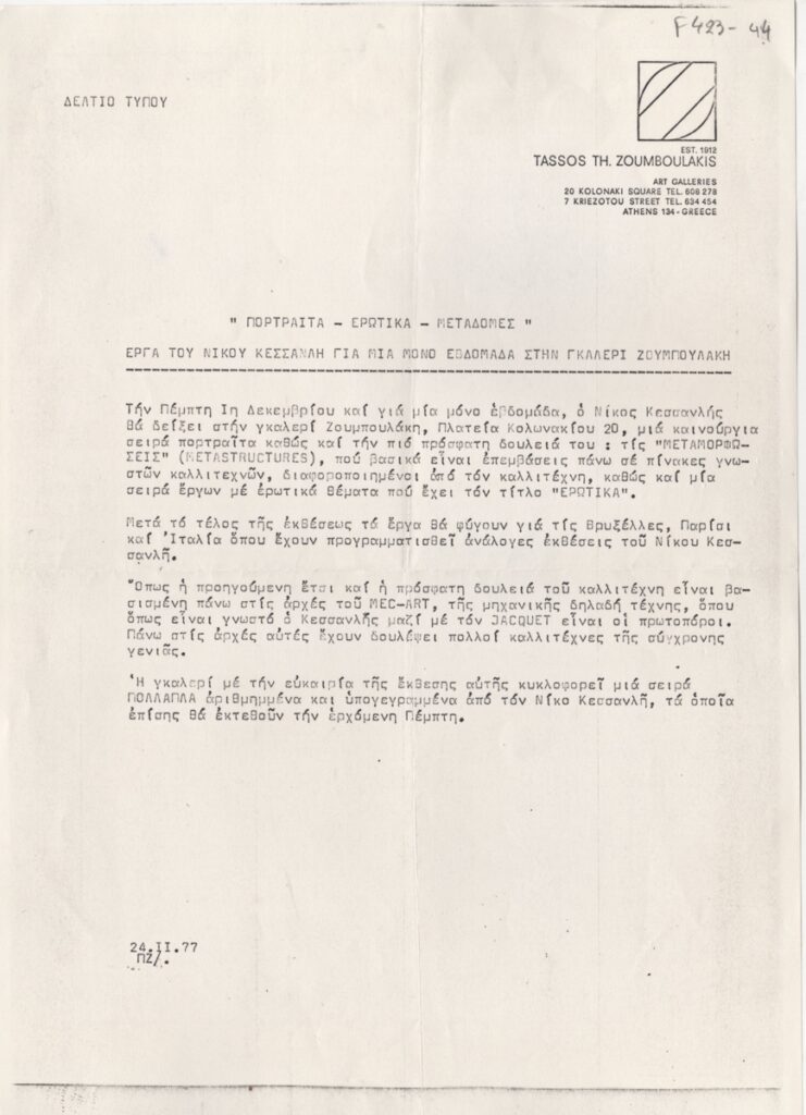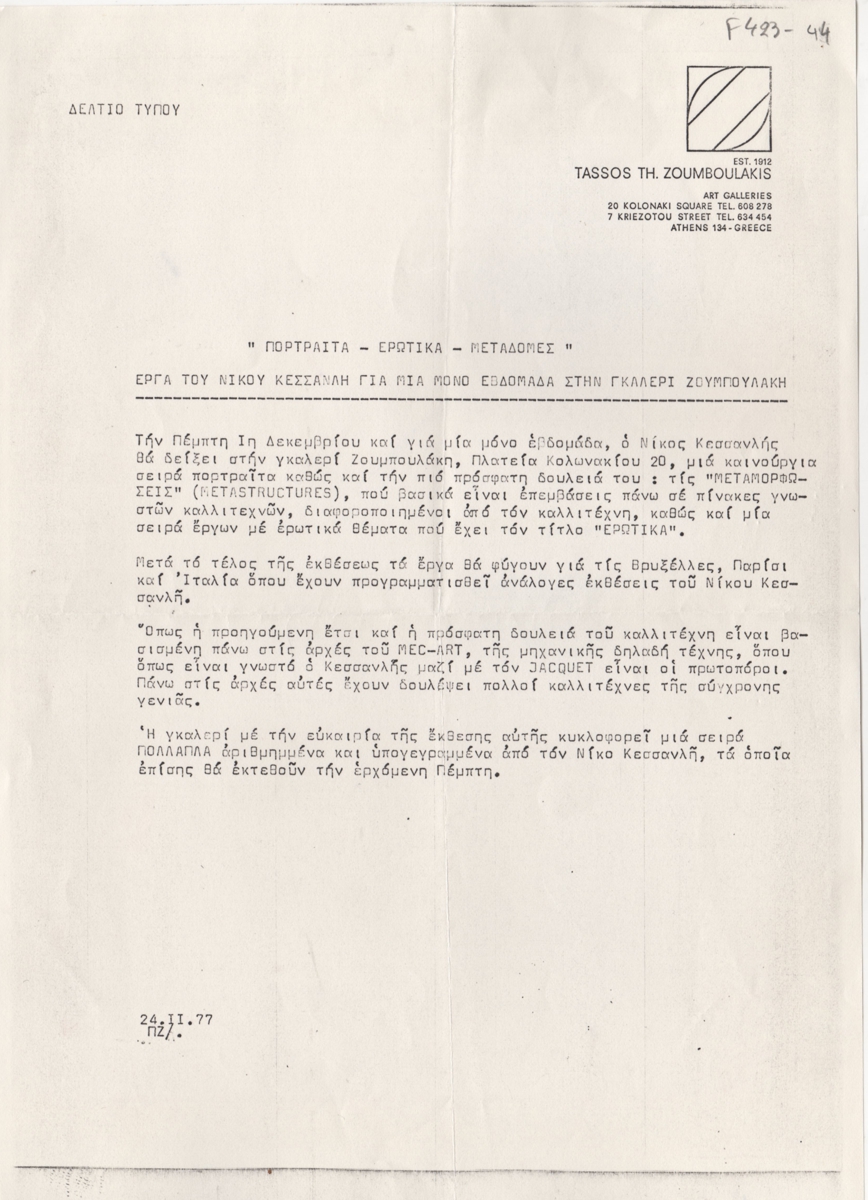 Δελτίο Τύπου, χαρτί, 29,5×21 εκ., στα ελληνικά, ατομικής έκθεσης του Νίκου Κεσσανλή, η οποία διεξάγεται στην γκαλερί Ζουμπουλάκη το 1977.