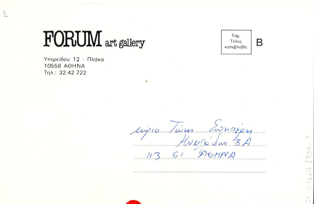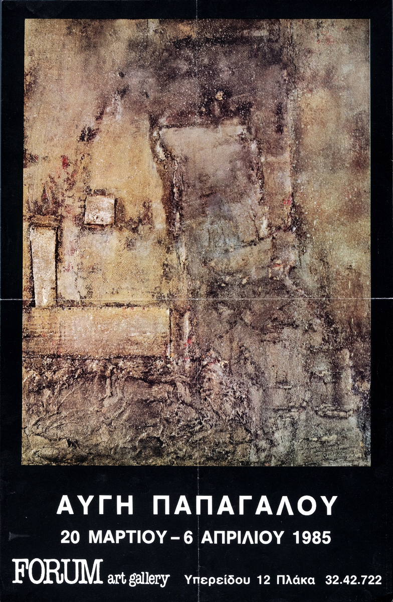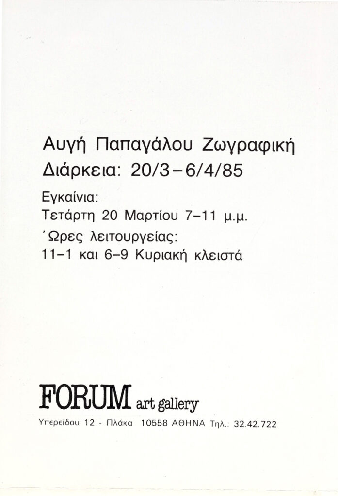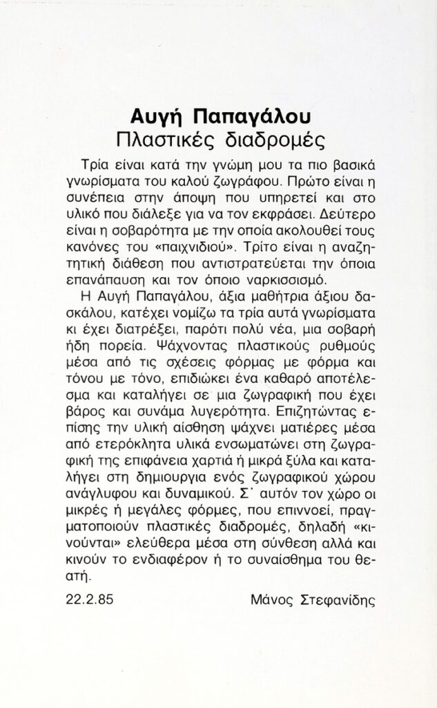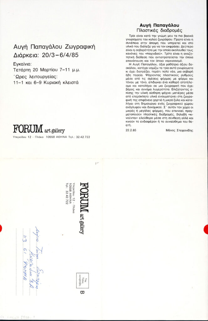 Έντυπο της ατομικής έκθεσης ζωγραφικής της Αυγής Παπαγάλου στην Αίθουσα Τέχνης “Forum” στην Αθήνα. Περιέχει κείμενο του Μάνου Στεφανίδη με τίτλο “Αυγή Παπαγάλου. Πλαστικές διαδρομές”.