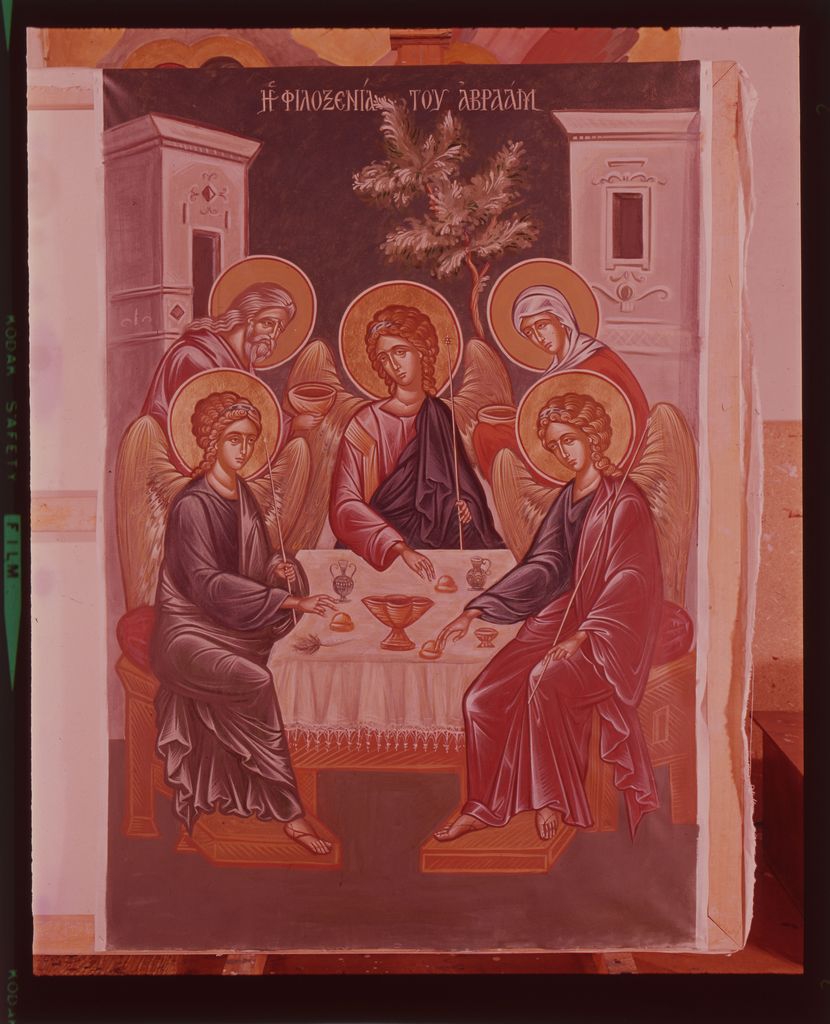Διαφάνεια, έγχρωμη, 7,5×6,2 εκ. Αναπαραγγή του έργου της Λίας Παπαγεωργοπούλου «Η Φιλοξενία του Αβραάμ», τοιχογραφία, Ι. Ν. Αγίας Παρασκευής Καρύστου, ιδιοκτησίας Ι. Λουμίδη.