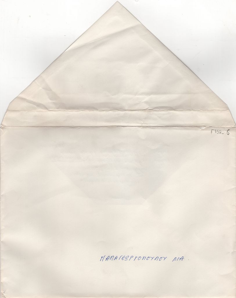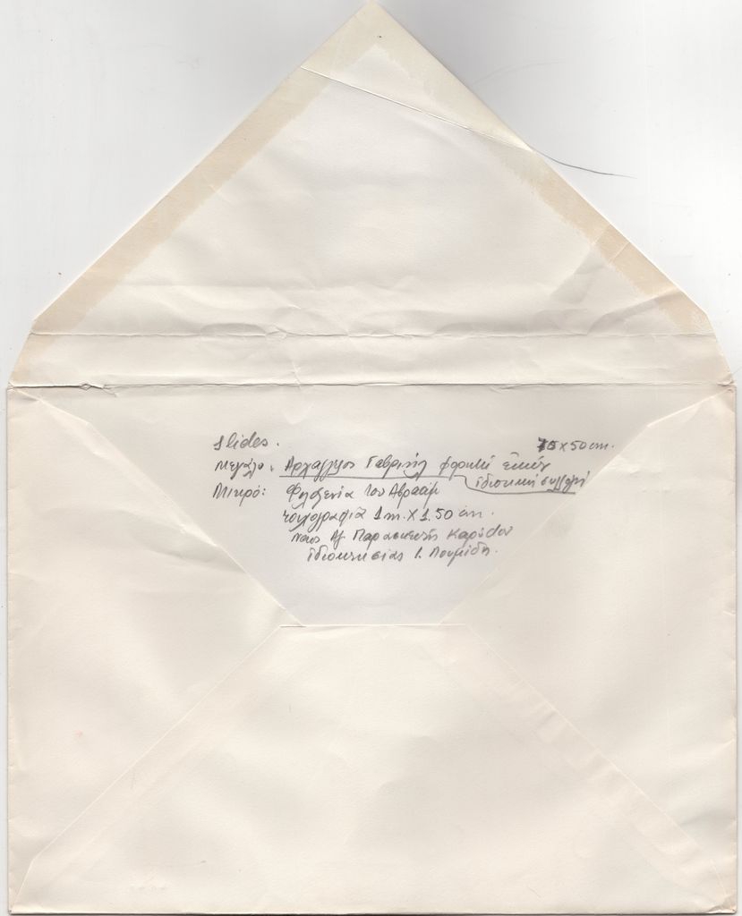Ταχυδρομικός φάκελος, χαρτί, 18,7×25,7 εκ., στο εσωτερικό του οποίου αναγράφονται, χειρόγραφα, με μολύβι, στα ελληνικά, τα στοιχεία των έργων της Λίας Παπαγεωργοπούλου που αναπαράγονται στις διαφάνεις GR TITSpit f752_4 και GR TITSpit f752_5.
