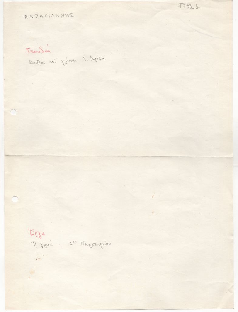 Κείμενο, χειρόγραφο, με κόκκινη ξυλομπογιά και μολύβι, χαρτί, 28,7×21,4 εκ. Σημειώσεις βιογραφικού του Δημοσθένη Παπαγιάννη. Αναφέρονται σπουδές και έργα.
