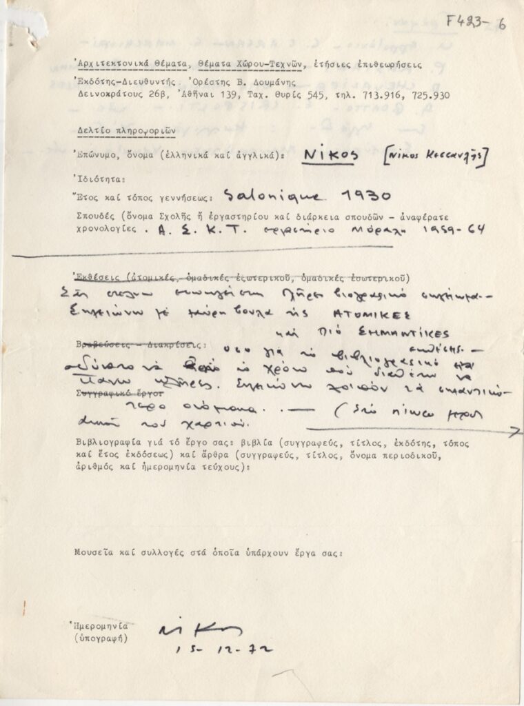 Φόρμα βιογραφικού, δακτυλόγραφο, χαρτί, 29×21 εκ., στα ελληνικά, συμπληρωμένο από τον Νίκο Κεσσανλή. Περιέχει πληροφορίες για εκθέσεις, βραβεύσεις, βιβλιογραφικές πληροφορίες, βραβεία, μουσεία που εκτίθενται έργα του και βιβλιογραφία, προκειμένου να δημοσιευτούν στο περιοδικό “Αρχιτεκτονικά Θέματα” και “Θέματα Χώρου-Τεχνών”.