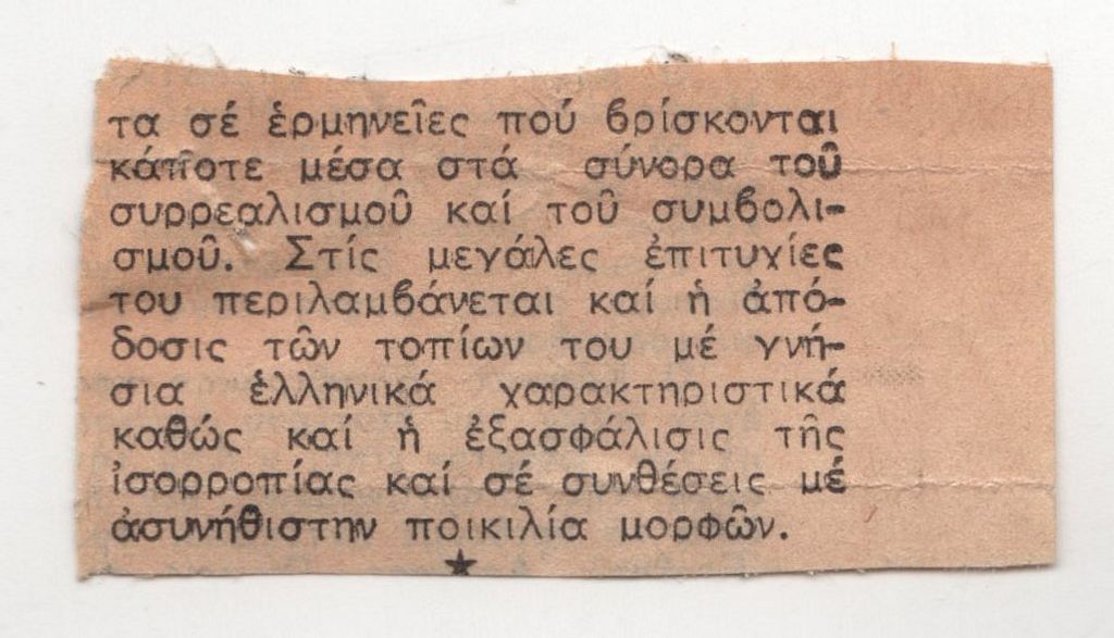 Αποκόμματα, έντυπα, χαρτί, 2 τμήματα, 11,0×5,5 και 3,0×5,7 εκ., όπου δημοσιεύεται, στα ελληνικά, κριτική της ατομικής έκθεσης χαρακτικής του Γιάννη Παπαδάκη στην Αθήνα το 1971. Δεξιά, επιγραφή με τα στοιχεία της δημοσίευσης.