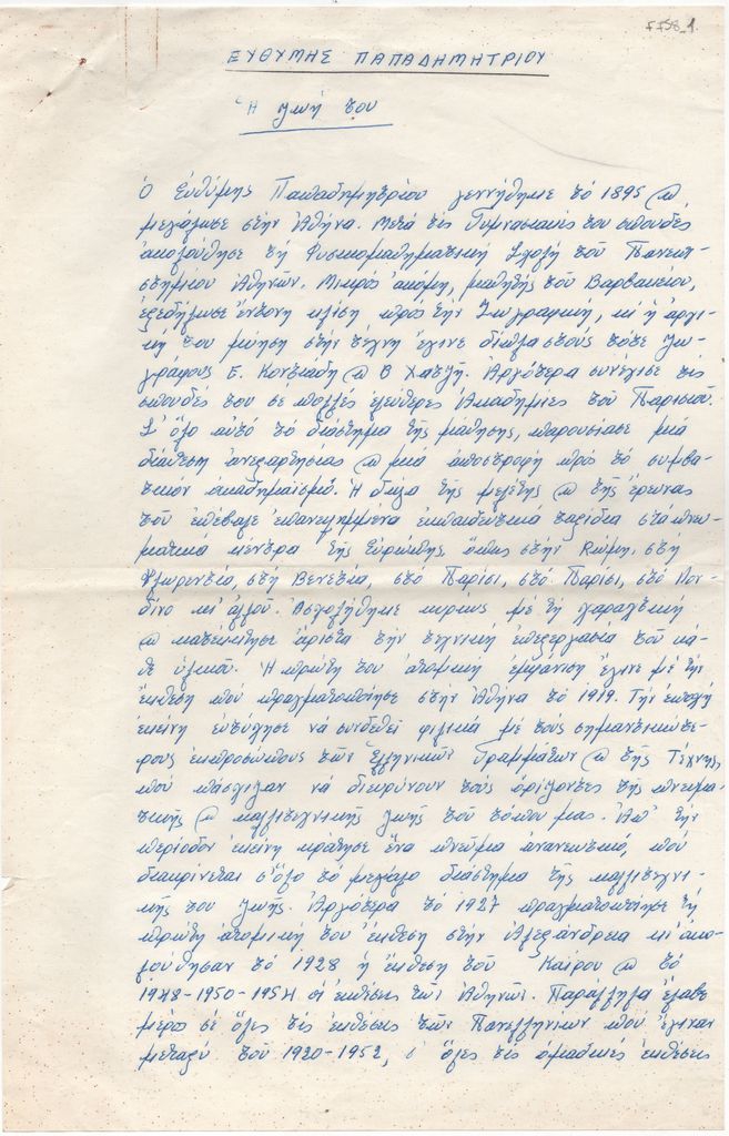 Κείμενο, χειρόγραφο, με μπλε μελάνι, στα ελληνικά, χαρτί, 2 φφ., μία όψη, 32,5×20,8 εκ. Βιογραφικό σημείωμα σε τρίτο πρόσωπο του Ευθύμη Παπαδημητρίου με τίτλο “Η ζωή του”. Αναφέρονται σπουδές, ατομικές και καλλιτεχνικές εκθέσεις και γενικές πληροφορίες για την καλλιτεχνική του πορεία.