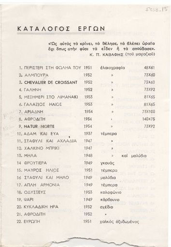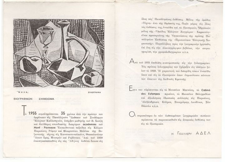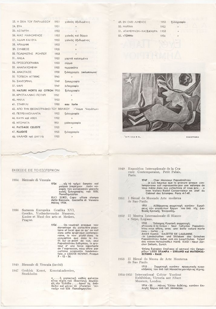 Έντυπο, στα ελληνικά, τετράπτυχο, χαρτί ιλουστρασιόν, 17,5×12,5 εκ. Έντυπο της ατομικής έκθεσης ζωγραφικής και χαρακτικής του Ευθύμη Παπαδημητρίου στην Αθήνα το 1955. Περιέχει σύντομο βιογραφικό καλλιτέχνη, κατάλογο εκθέσεων στο εξωτερικό (με αποσπάσματα κριτικών) και κατάλογο έργων.