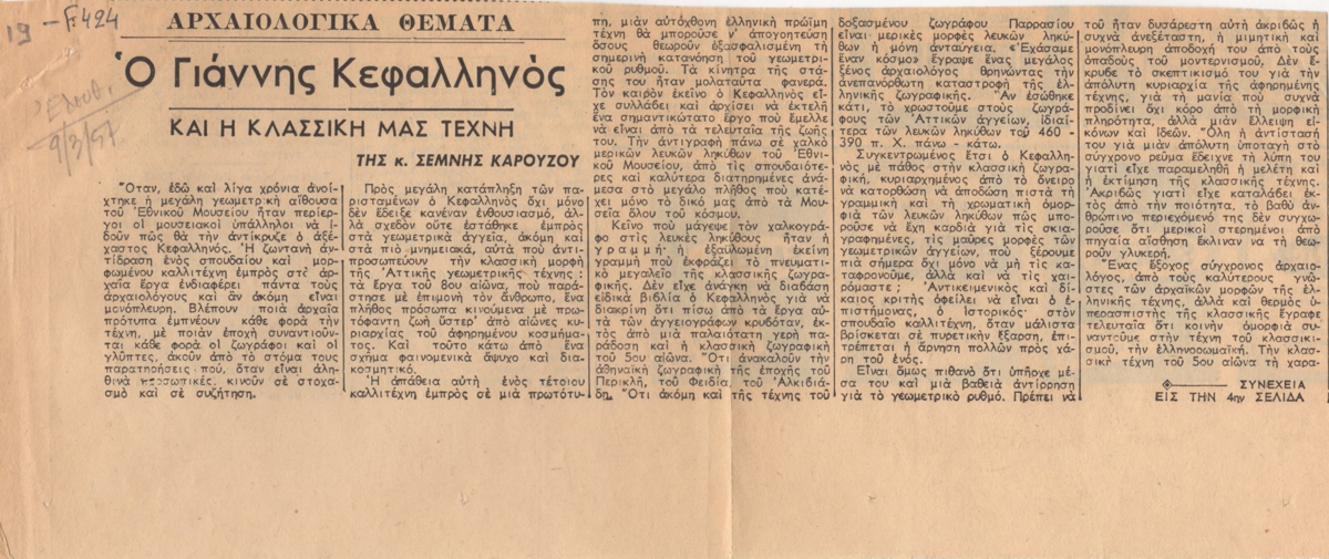 Απόκομμα, χαρτί, 2 φφ, 11×26,5 και 21×10 εκ., στα ελληνικά, δημοσίευσης άρθρου για το έργο του Γιάννη Κεφαλληνού. Ειδικότερα, γίνεται λόγος για την αφοσίωση του καλλιτέχνη στην κλασική τέχνη και τις αγγειογραφίες που φιλοτέχνησε για το Αρχαιολογικό Μουσείο Αθηνών. Το απόκομμα φέρει επιγραφές.