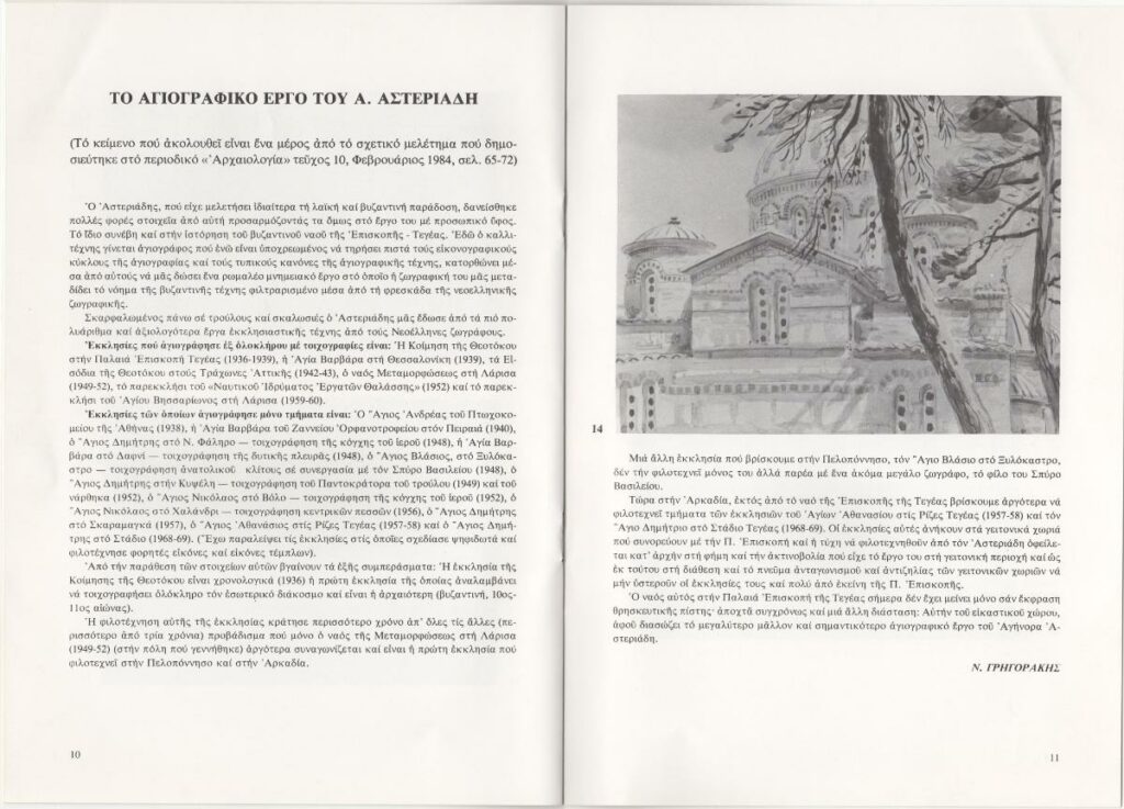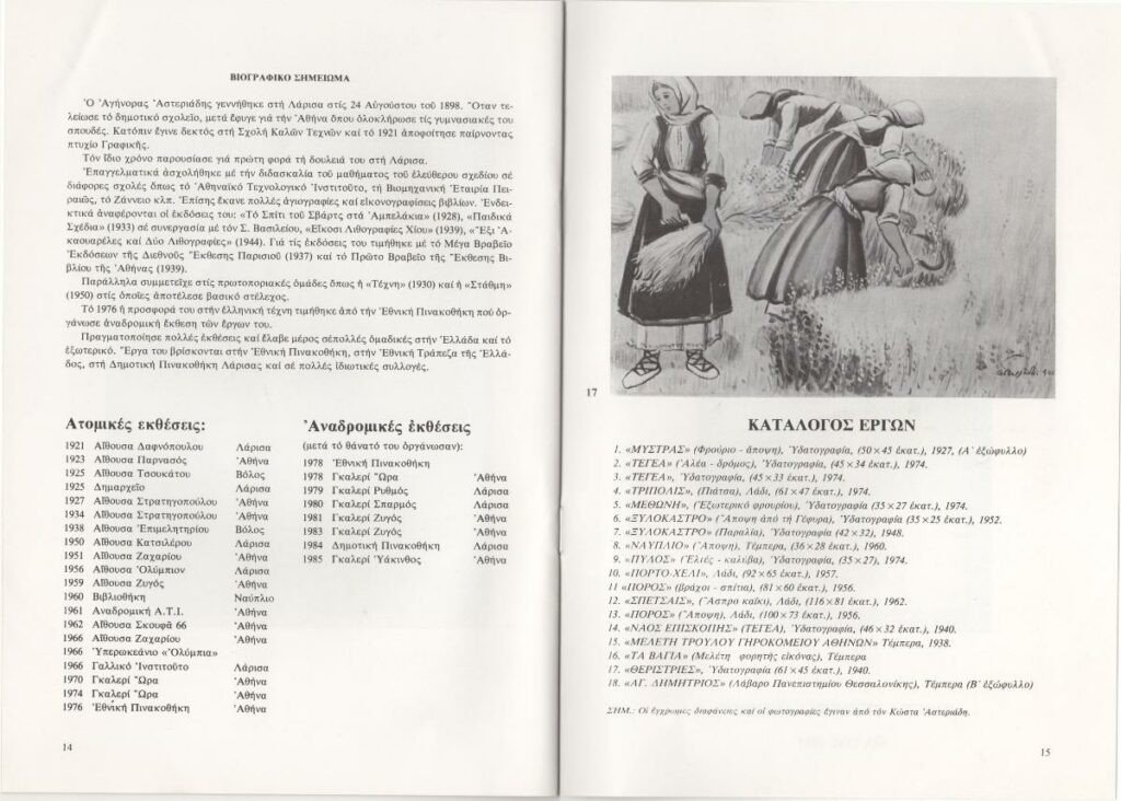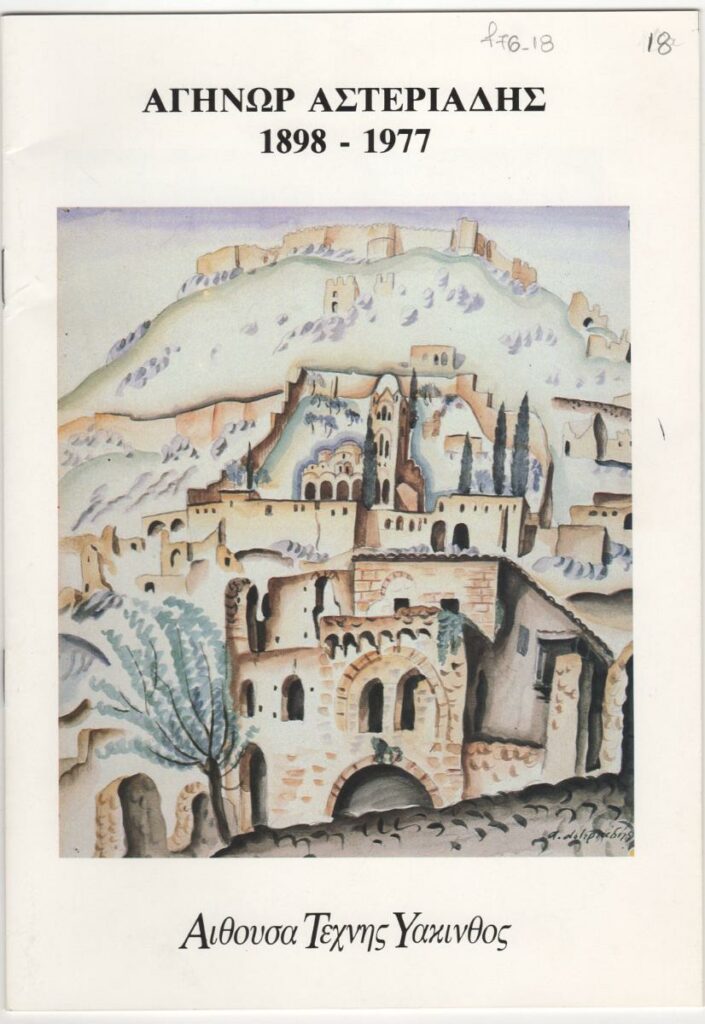 Φυλλάδιο της έκθεσης έργων του Αγήνορα Αστεριάδη στην Αθήνα. Περιλαμβάνει τα εξής κείμενα: Ν. Γρηγοράκης “Λίγα λόγια για την προσφορά του Αγήνορα Αστεριάδη”, “Το αγιογραφικό έργο του Α. Αστεριάδη”, βιογραφικό σημείωμα καλλιτέχνη και κατάλογο έργων.