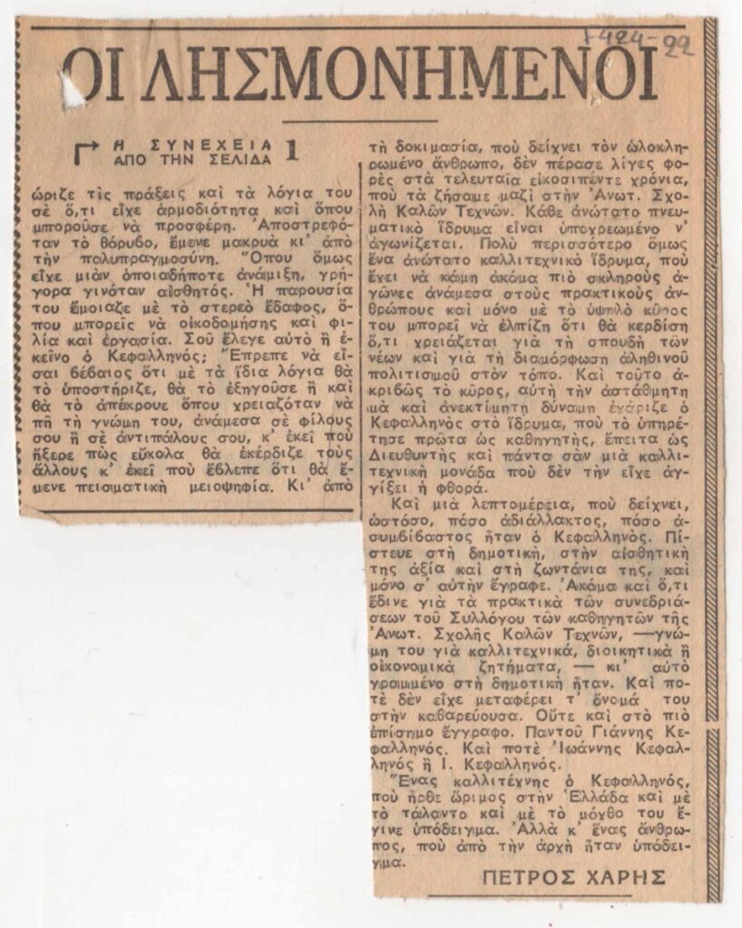 Απόκομμα, χαρτί, 2 φφ ακανόνιστου μεγέθους, στα ελληνικά, δημοσίευσης άρθρου για τη ζωή και το έργο του Γιάννη Κεφαλληνού, με αφορμή το θάνατο του καλλιτέχνη.