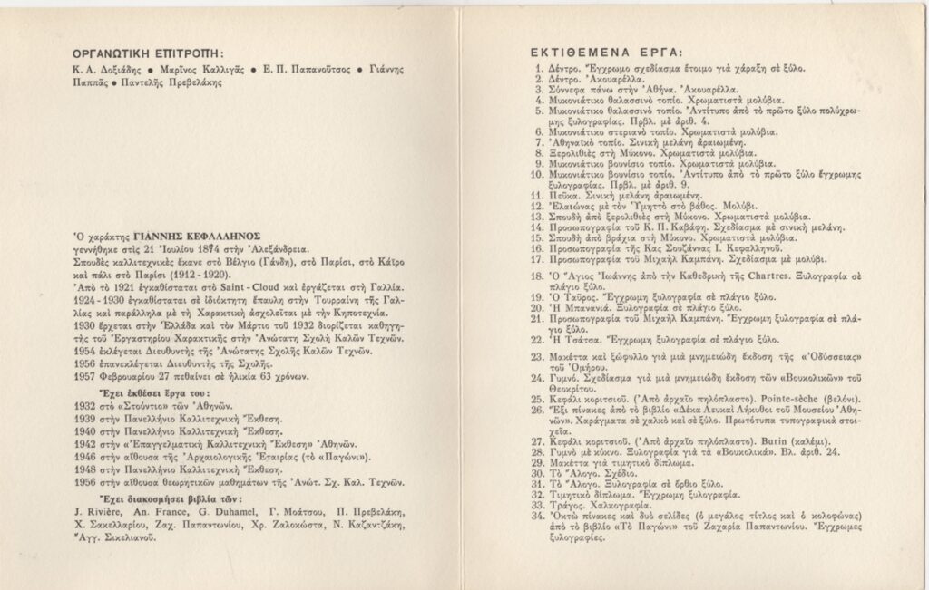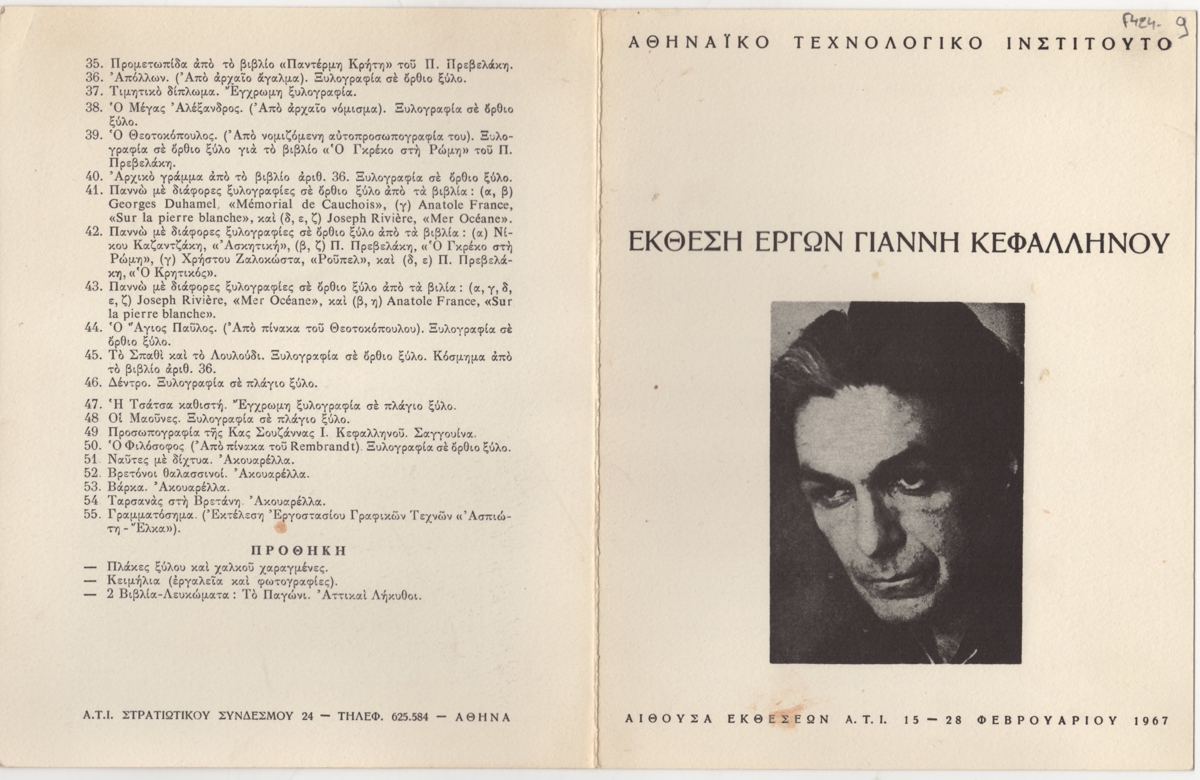 Έντυπο, χαρτόνι αναδιπλωμένο, 21×16,5 εκ., στα ελληνικά, ατομικής έκθεσης του Γιάννη Κεφαλληνού. Περιέχει βιογραφικό του καλλιτέχνη και κατάλογο έργων.