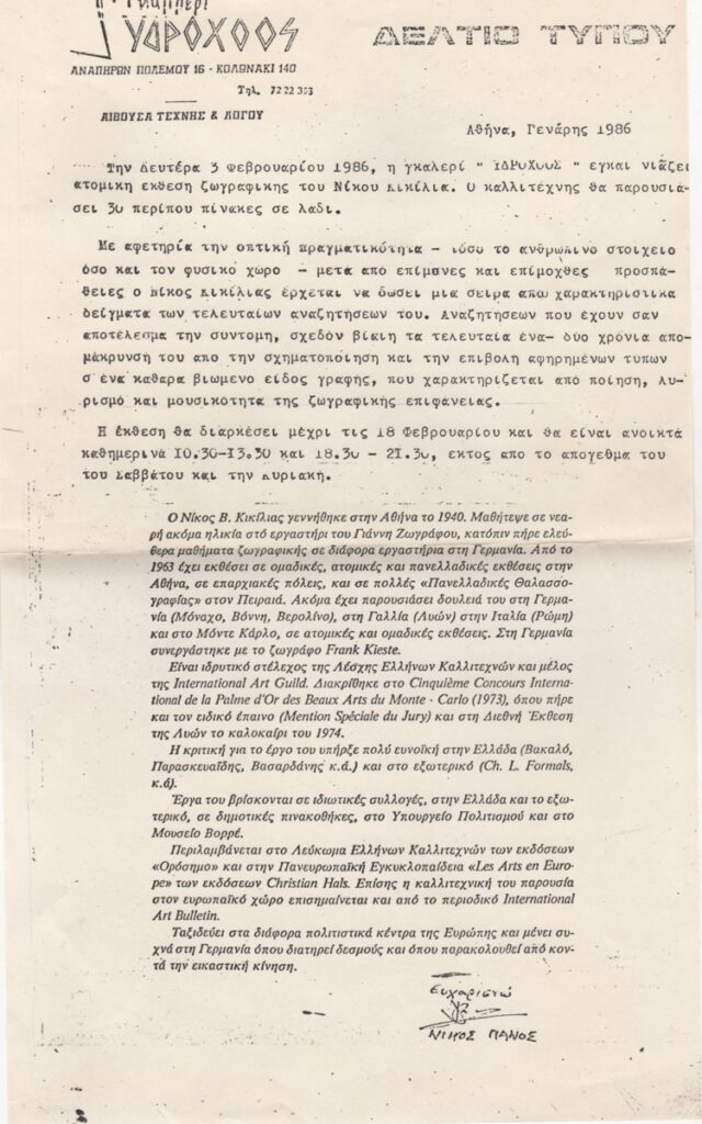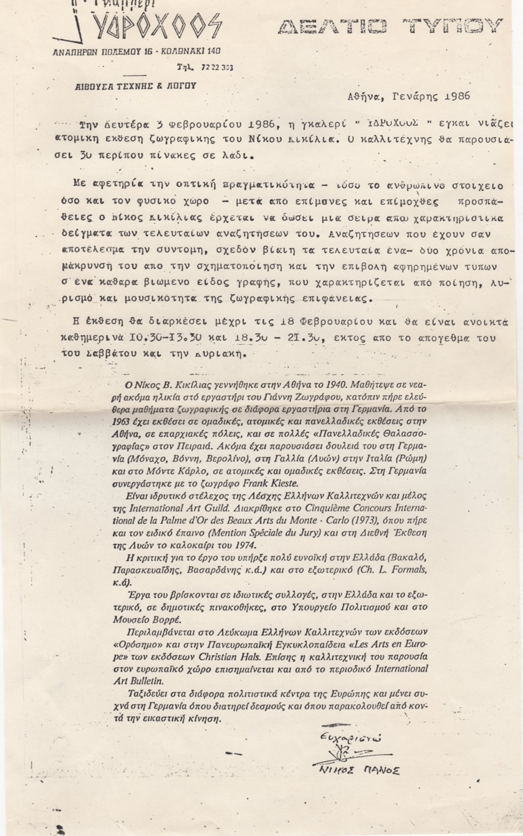 Φωτοαντίγραφο δελτίου Tύπου, χαρτί, 35,5×21,5 εκ., στα ελληνικά, ατομικής έκθεσης ζωγραφικής του Νίκου Κικίλια. Περιέχει πληροφορίες για την έκθεση και βιογραφικό του καλλιτέχνη.