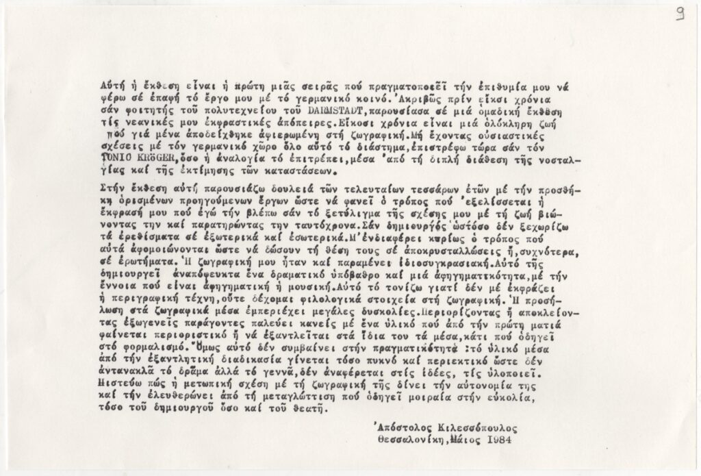 Έντυπο, χαρτί,16,3×24 εκ., στα ελληνικά, δημοσίευσης άρθρου του Απόστολου Κιλεσσόπουλου για το έργο του που παρουσιάζει σε ατομική του έκθεση στην γκαλερί Experiment στη Στουτγκάρδη, το 1984.