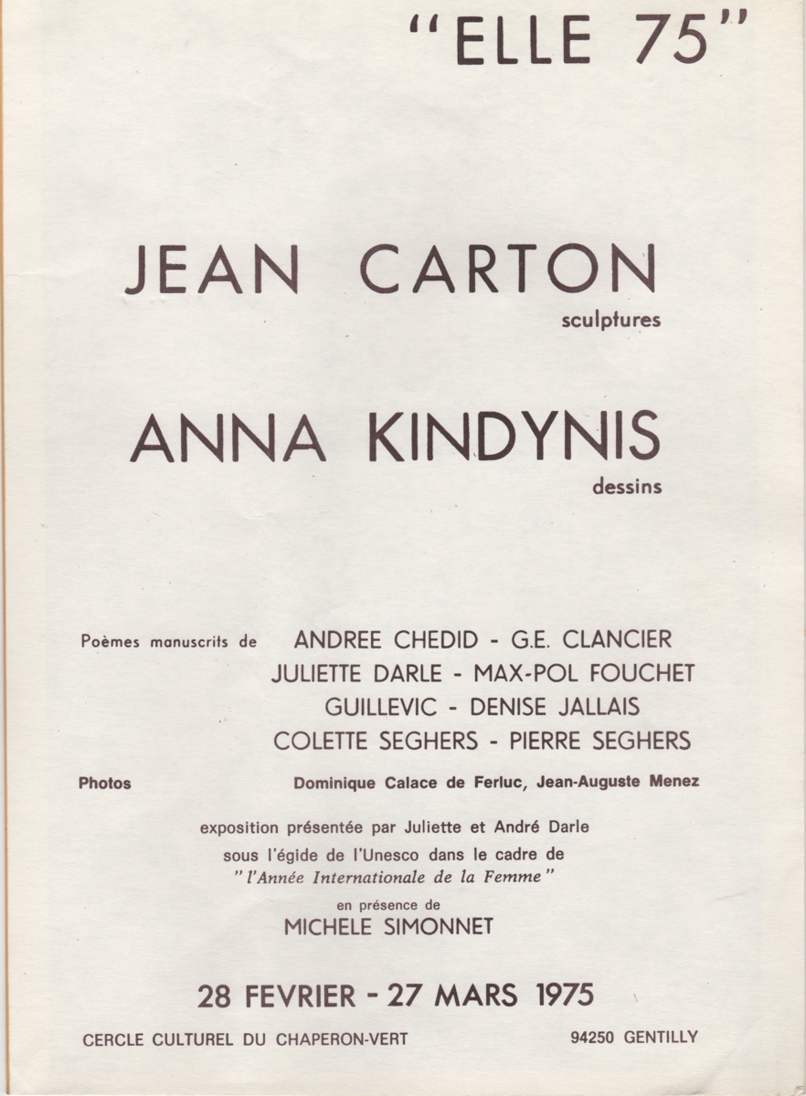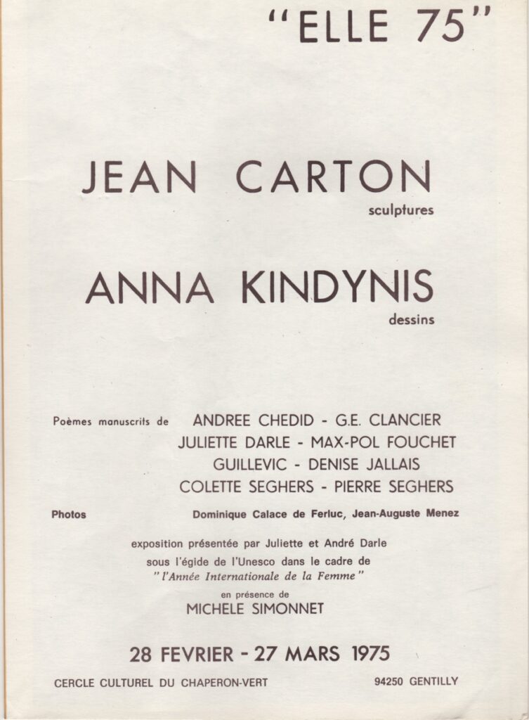 Έντυπο, χαρτί, 7 φφ, 29,5×20,5 εκ., στα γαλλικά, ομαδικής έκθεσης των Άννας Κινδύνη Μαρουδή και Jean Carton, στο πλαίσιο εορτασμού της Γυναίκας “Année Internationale de la Femme”, υπό την αιγίδα της Unesco.