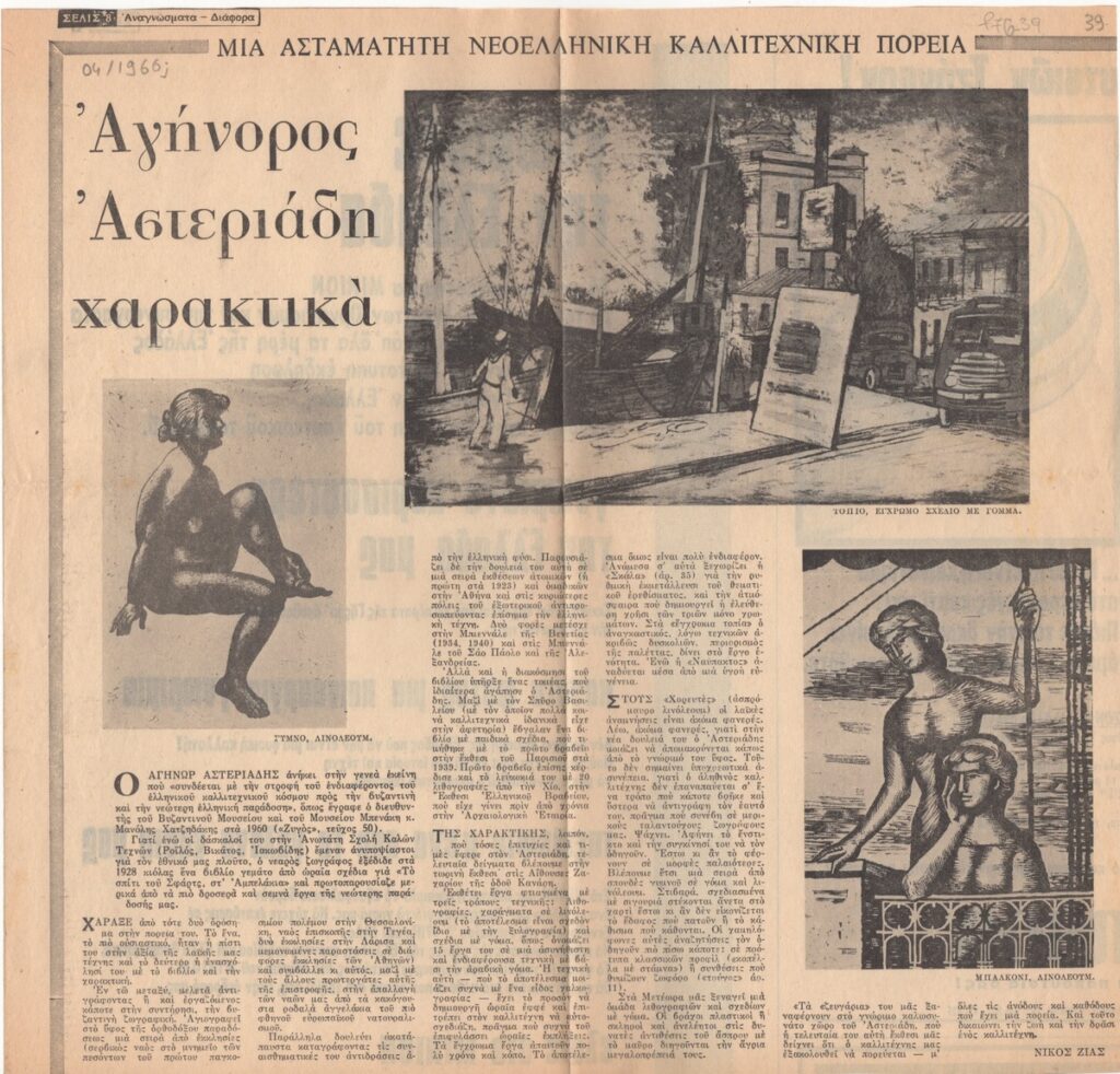 Απόκομμα εφημερίδας (04/1966;), όπου δημοσιεύεται κριτική του Νίκου Ζία για την ατομική έκθεση χαρακτικής του Αγήνορα Αστεριάδη στην Αθήνα.