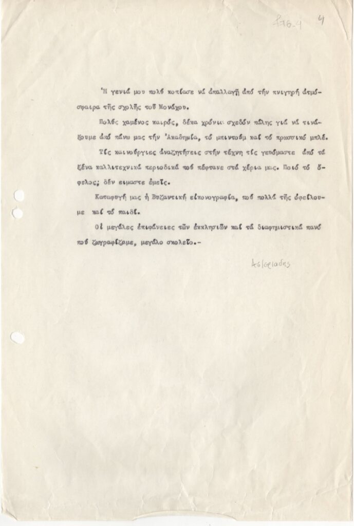 Κείμενο, δακτυλόγραφο, χαρτί, 29,5×19,8 εκ., στα ελληνικά. Κείμενο του ζωγράφου Αγήνορα Αστεριάδη για τους καλλιτέχνες της γενιάς του. Κάτω από το κείμενο επιγραφή.