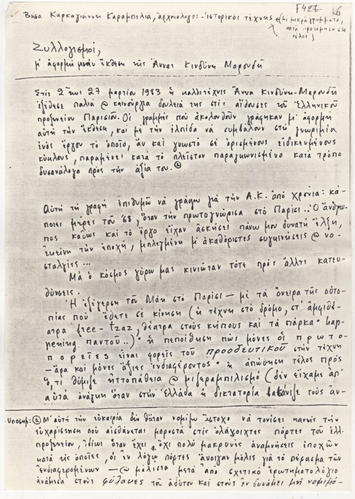 Φωτοαντίγραφο, χαρτί, 7 φφ, 29.5×21 εκ., στα ελληνικά, κειμένου της Βήσας Καρκαγιάννη-Καράμπελια, για το έργο της Άννας Κινδύνη, στο πλαίσιο έκθεσης της καλλιτέχνιδας στο Παρίσι.