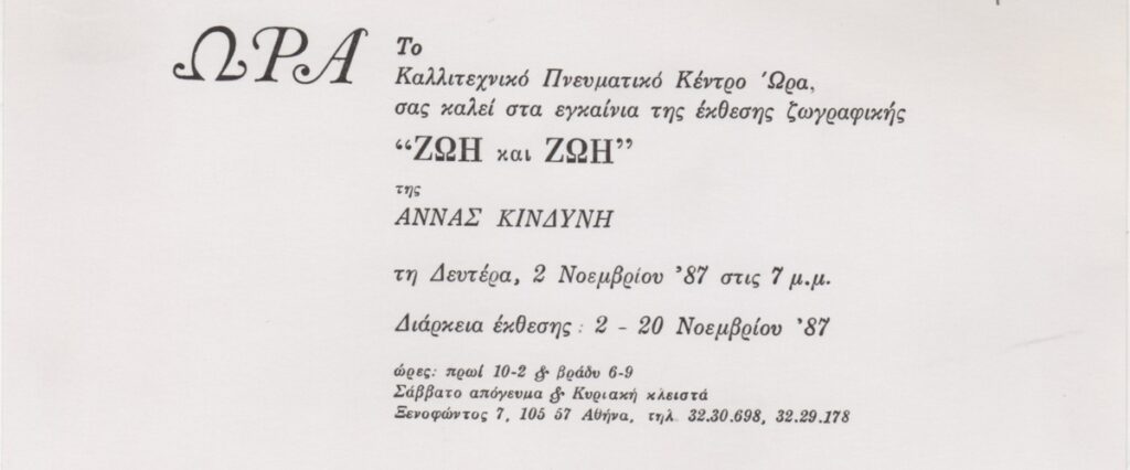 Πρόσκληση, χαρτόνι, 10×20 εκ., στα ελληνικά, εγκαινίων ατομικής έκθεσης της Άννας Κινδύνη, η οποία διεξάγεται στο Καλλιτεχνικό Πνευματικό Κέντρο Ώρα στην Αθήνα.