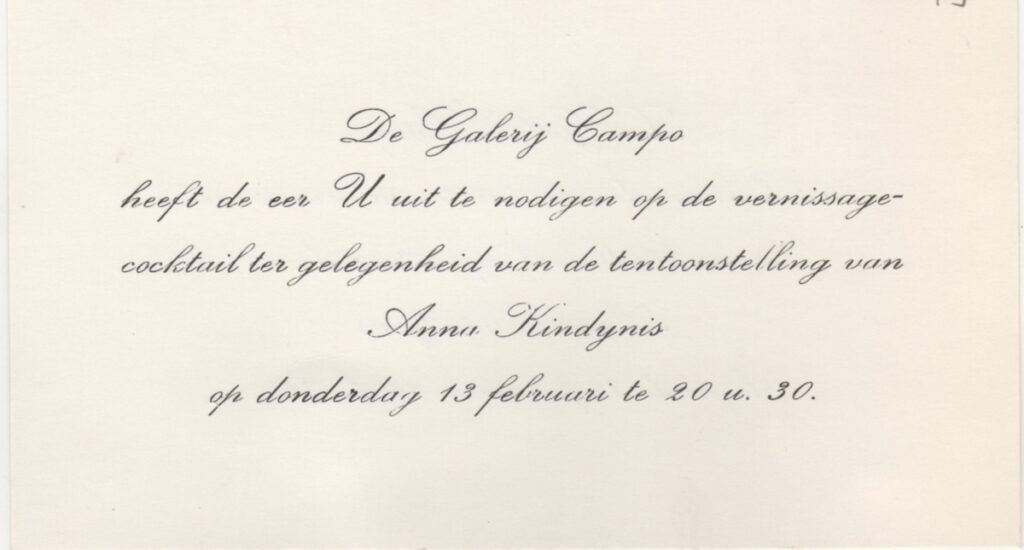 Πρόσκληση, χαρτόνι, 8.5×14 εκ., στα ολλανδικά, εγκαινίων ατομικής έκθεσης της Άννας Κινδύνη.