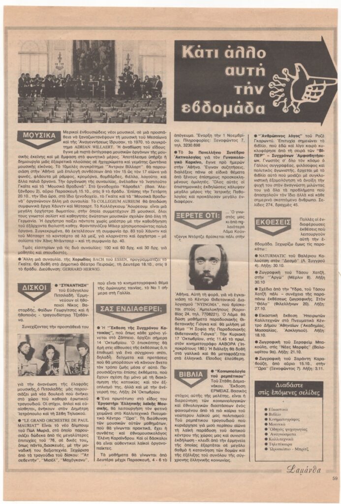 Απόκομμα, έντυπο, χαρτί, 30,5×20,5 εκ., όπου δημοσιεύεται, στα ελληνικά, μουσικές εκδηλώσεις, βιβλιοκρισίες και αναγγελίες εκθέσεων της περιόδου. Συγκεκριμένα αναφέρονται: συναυλία του συγκροτήματος “Adrian Willaert” και του Gollegium Aureum στην Αθήνα, καθώς και της Χορωδίας Bach του Essen στο Δημοτικό Θέατρο Πειραιώς. Επίσης, η κυκλοφορία του δίσκου “Συνάντηση” του Ευάγγελου Πιτισιλαδή, η “Έκθεση της Συγχρόνου Κατοικίας” στο Ζάππειο και η κυκλοφορία του βιβλίου του Στάθη Δαμιανάκου “Κοινωνιολογία του ρεμπέτικου”. Στο εκθεσιολόγιο της περιόδου αναφέρονται οι εκθέσεις του Β. Καλούτση, του Τ. Χατζή, του Σ. Μπακούλη, του Σ. Καραβούζη και Ηπειρωτών Καλλιτεχνών. Στην πίσω σελίδα κριτική αναδρομικής έκθεσης του Α. Αστεριάδη.