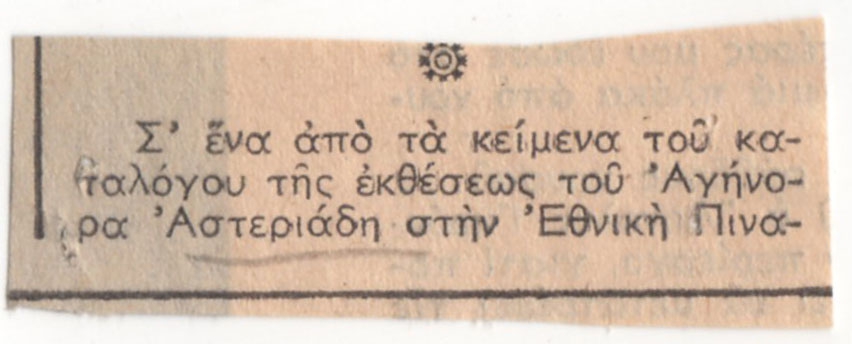 Αποκόμματα εντύπου, χαρτί, 17,2×5,3 εκ., όπου δημοσιεύεται, στα ελληνικά, κριτική της Ντόρας Ηλιοπούλου-Ρογκάν για την την αναδρομική έκθεση έργων του ζωγράφου και χαράκτη Αγήνορα Αστεριάδη που διοργανώθηκε στην Εθνική Πινακοθήκη στην Αθήνα το 1976. Επάνω, επιγραφή.