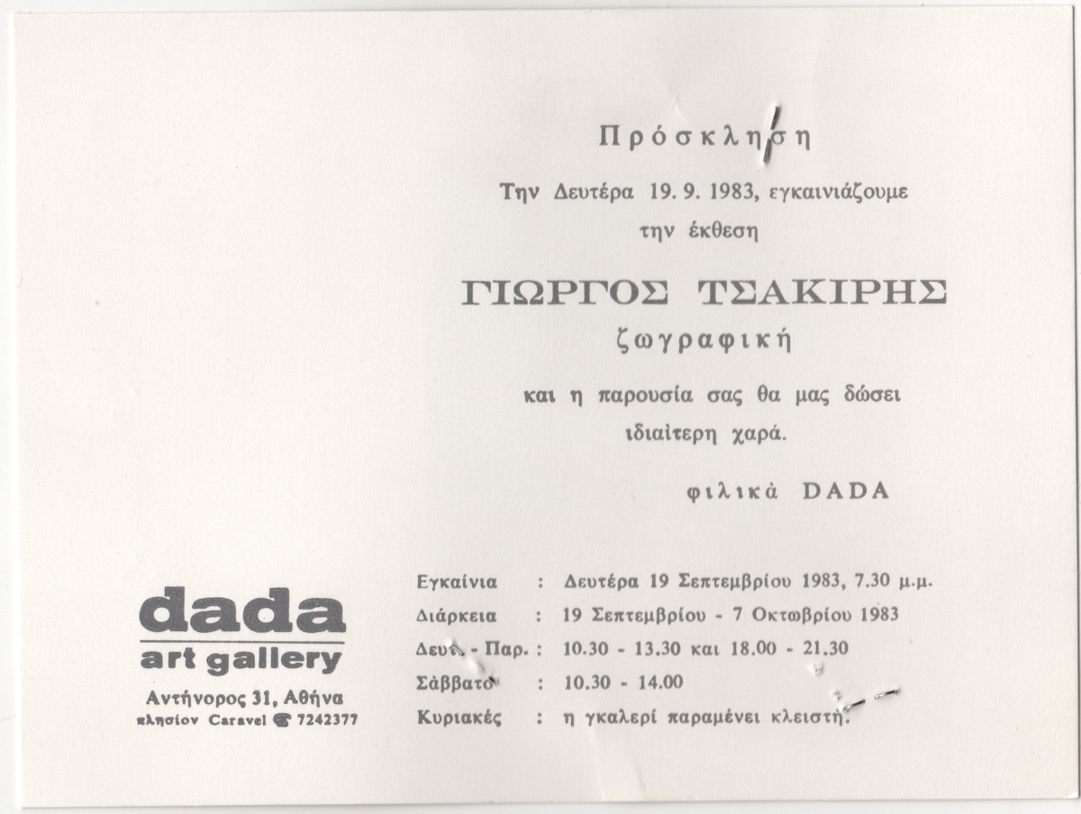 Έντυπο, στα ελληνικά, μονόφυλλο, χαρτόνι, 12,5×16,5 εκ. Πρόσκληση εγκαινίων της έκθεσης ζωγραφικής του Γιώργου Τσακίρη στην στην Αθήνα το 1983.