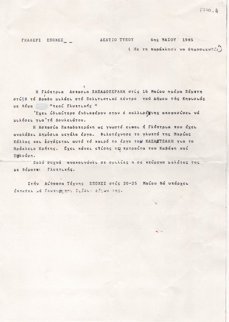 Κείμενο, δακτυλόγραφο, στα ελληνικά, 30,0×21,0 εκ. Δελτίο τύπου για την ομιλία της Ασπασίας Παπαδοπεράκη με θέμα “Περί γλυπτικής” στο Πολιτιστικό Κέντρο Δήμου Κηφισιάς στην Αθήνα στις 16/05/1985 και τη διοργάνωση ατομικής έκθεσης με τίτλο «Ασπασία Παπαδοπεράκη. Γλυπτική Σχέδια» στην Αίθουσα Τέχνης Εποχές στην Αθήνα το 1985.