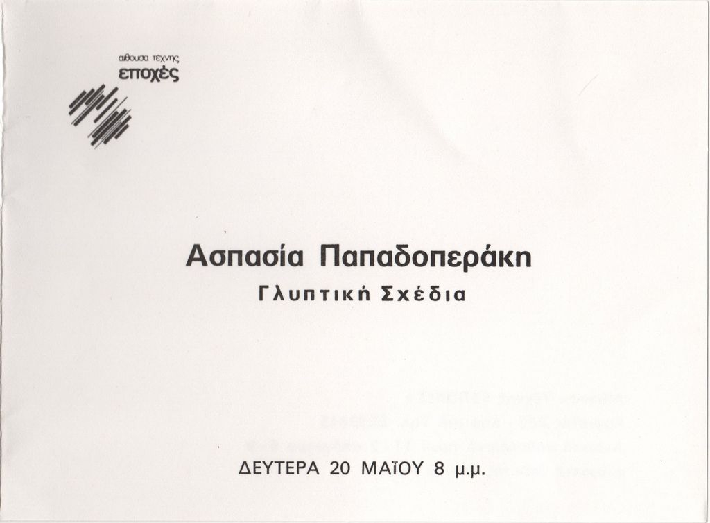 Έντυπο, στα ελληνικά, δίπτυχο, χαρτόνι, 11,5×15,5 εκ. Πρόσκληση εγκαινίων της ατομικής έκθεσης γλυπτικής της Ασπασίας Παπαδοπεράκη στην Αθήνα το 1985. Αναγγέλεται επίσης η ομιλία της καλλιτέχνιδας με θέμα “Περί Γλυπτικής” στο Πολιτιστικό Κέντρο Κηφισιάς στις 16/05/1985.