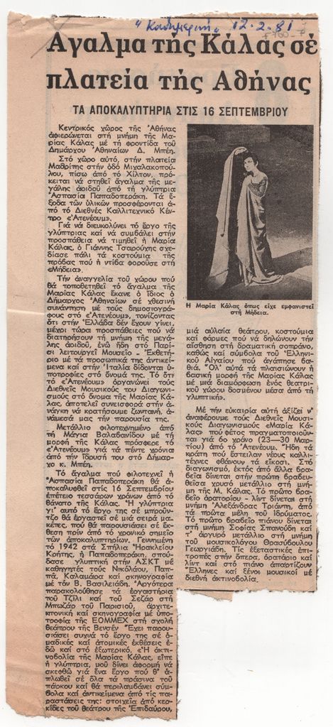 Απόκομμα, έντυπο, χαρτί, 25,5×11,5 εκ., όπου δημοσιεύεται, στα ελληνκά, άρθρο για τα επικείμενα αποκαλυπτήρια του αγάλματος της Μαρίας Κάλλας, που φιλοτέχνησε η Ασπασία Παπαδοπεράκη, στην Πλατεία Μαδρίτης, πίσω από το Χίλτον, στην Αθήνα. Επάνω, επιγραφή με τα στοιχεία της δημοσίευσης.