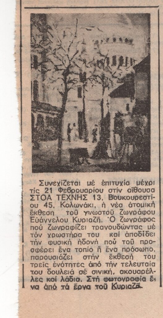 Απόκομμα, έντυπο, χαρτί, 30,5×20,0 εκ. όπου δημοσιεύεται, στα ελληνικά, σύντομη κριτική της ατομικής έκθεσης ζωγραφικής του Ευάγγελου Κυριαζή στην αίθουσα “Στοά Τέχνης” στην Αθήνα το 1981.