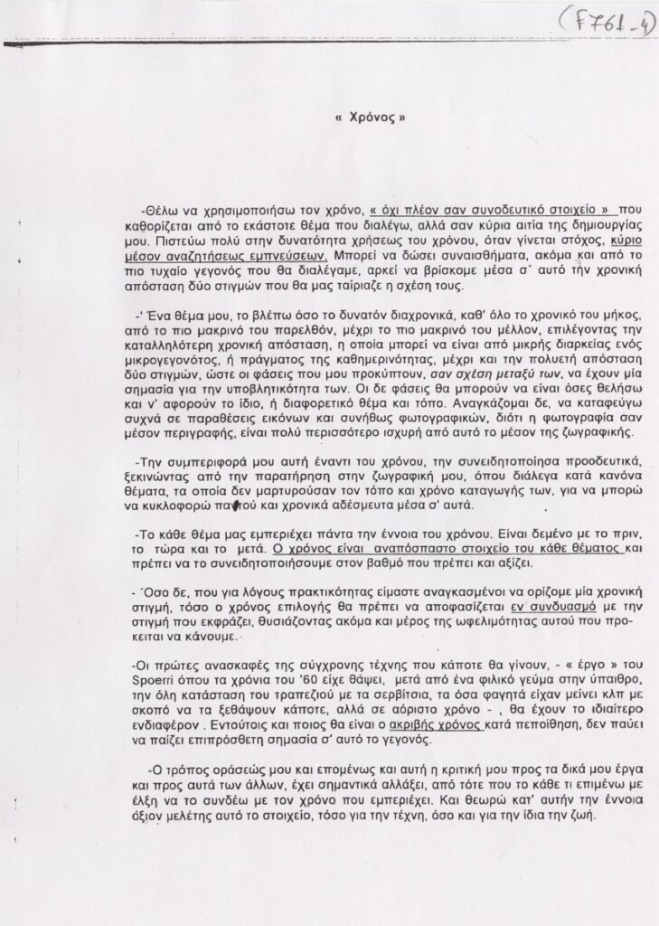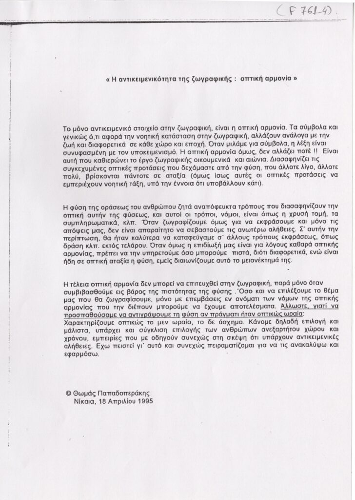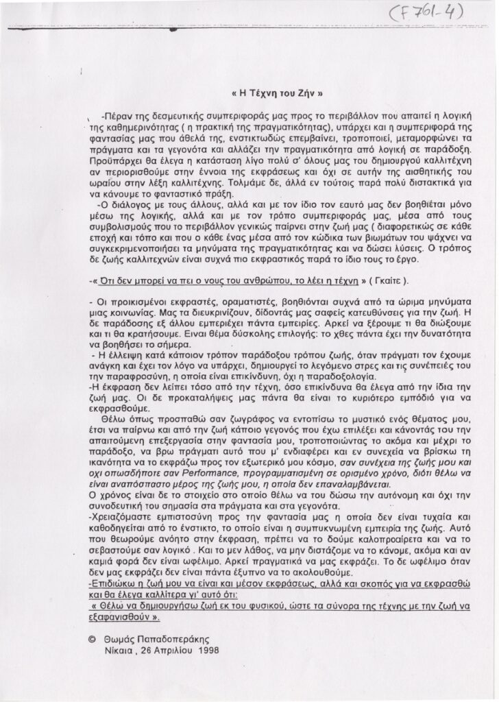 Φωτοαντίγραφο, χαρτί, 7 φφ, 30×21 εκ., στα ελληνικά, κειμένων του Θωμά Παπαδοπεράκη για το έργο του. Φέρουν τίτλους: “Η αντικειμενικότητα της ζωγραφικής: Οπτική αρμονία”, “Θέλοντας να καταστρέψω την ζωγραφική μου, αλλά με τα ίδια της τα μέσα”, “Χρόνος”, “Η Τέχνη του Ζην”.