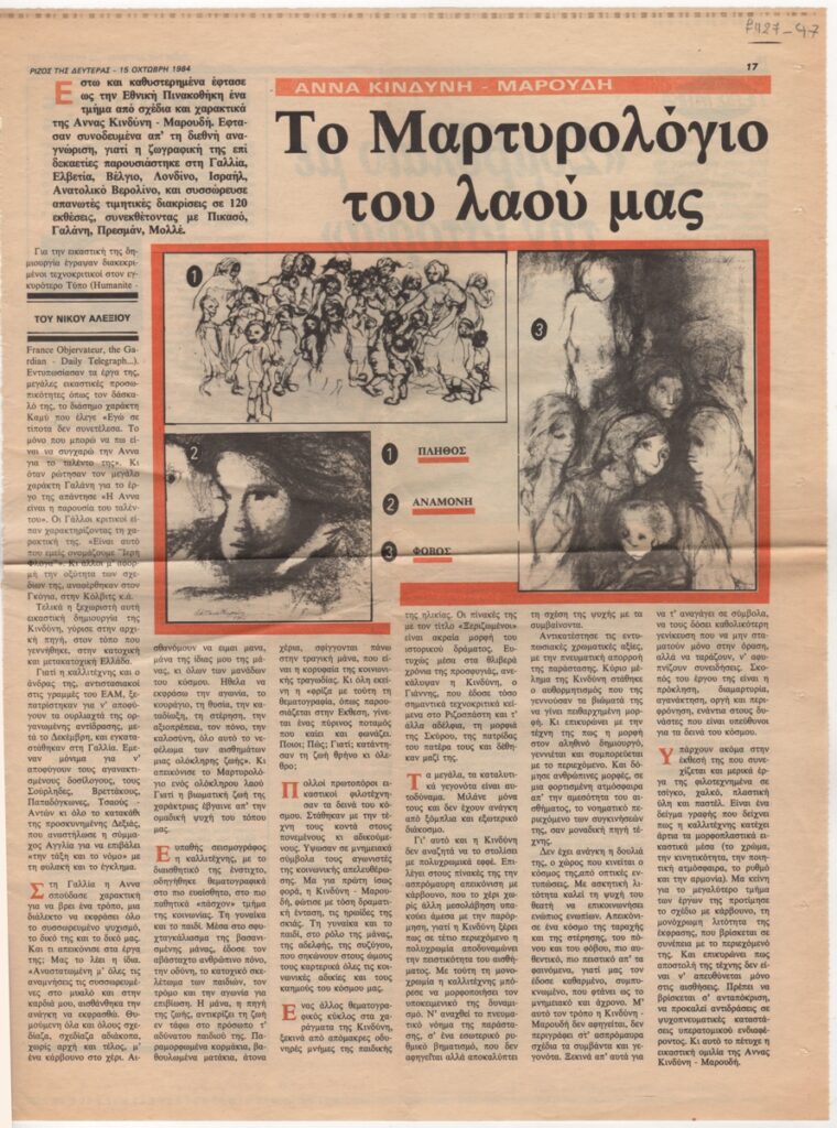 Απόκομμα, χαρτί, 39×29 εκ., στα ελληνικά, δημοσίευσης άρθρου αναφερόμενου στο εικαστικό έργο της Άννας Κινδύνη, με αφορμή έργα της καλλιτέχνιδας στην Εθνική Πινακοθήκη.