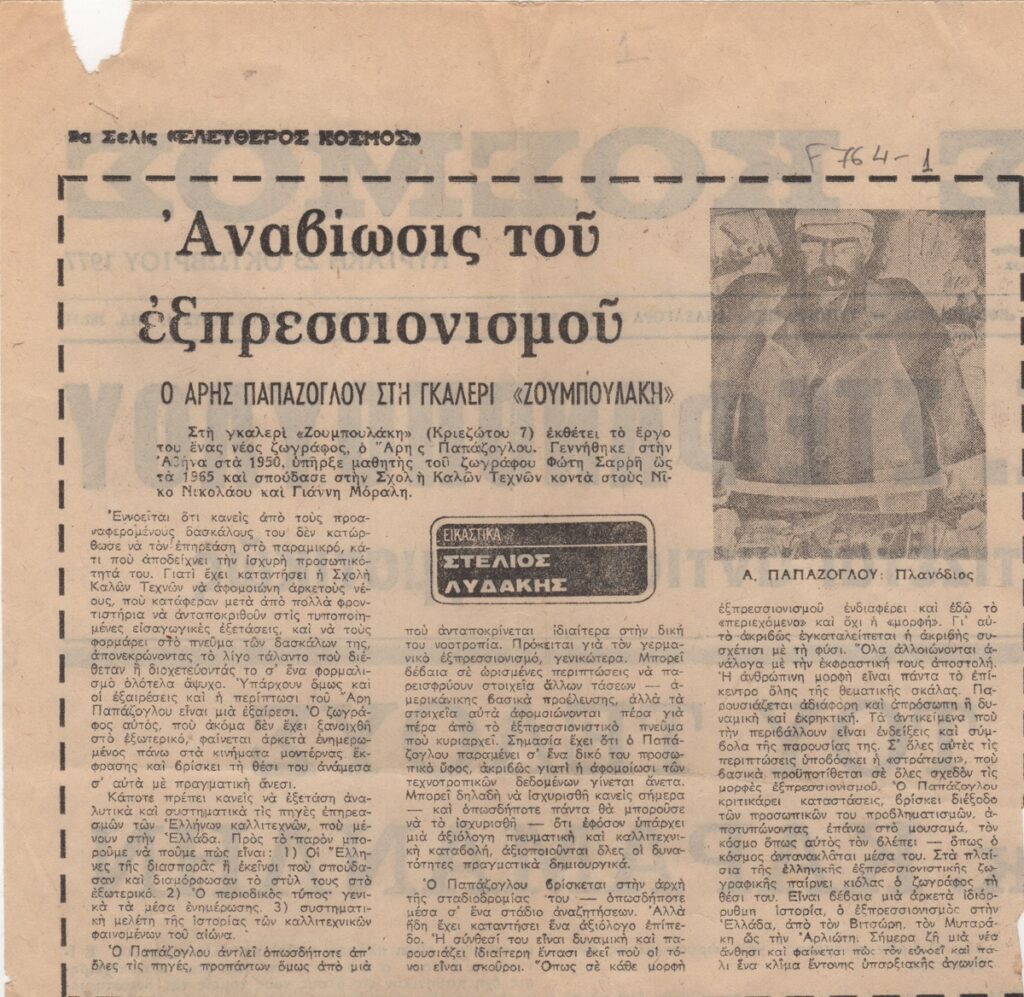Απόκομμα, χαρτί, 21×21 εκ., στα ελληνικά, δημοσίευσης κριτικής έκθεσης του Άρη Παπάζογλου, η οποία διεξάγεται στην Γκαλερί Ζουμπουλάκη, στην Αθήνα.