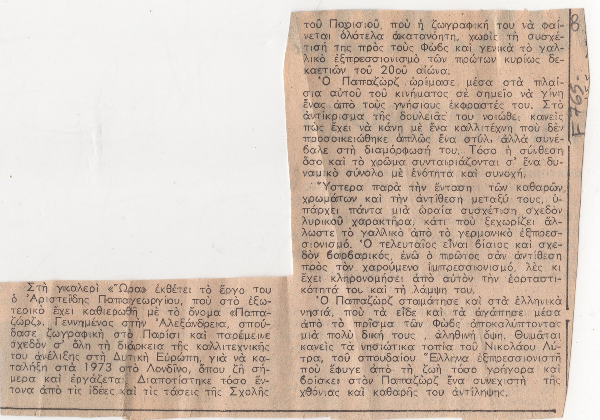Απόκομμα, χαρτί ακανόνιστου μεγέθους, στα ελληνικά, δημοσίευσης κριτικής έκθεσης του Αριστείδη Παπαζώρζη, η οποία διεξάγεται στο Καλλιτεχνικό Πνευματικό Κέντρο Ώρα στην Αθήνα.
