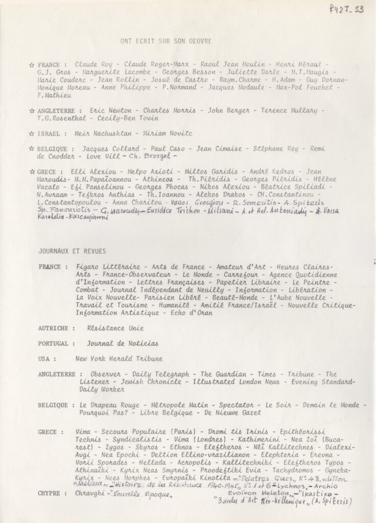 Κείμενο, δακτυλόγραφο, χαρτί, 29×21 εκ., στα γαλλικά, για την Άννα Κινδύνη με αναφορά σε κριτικές που έγιναν για το έργο της ανά χώρα.