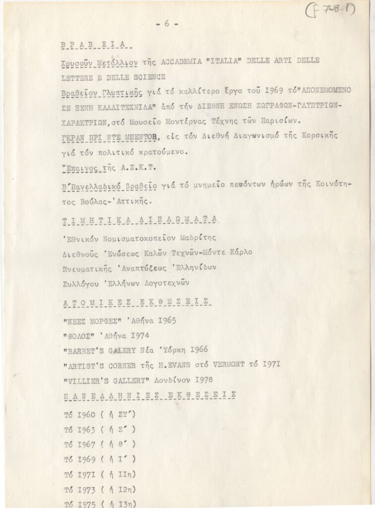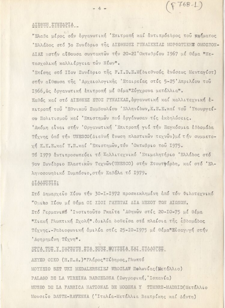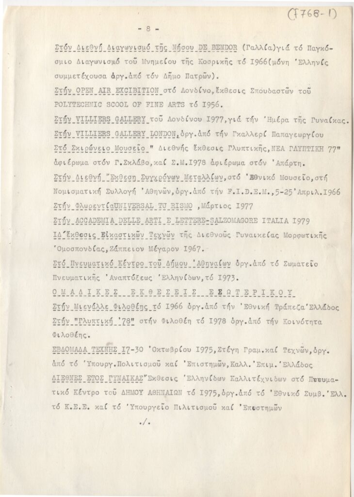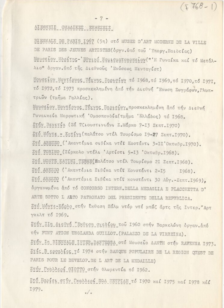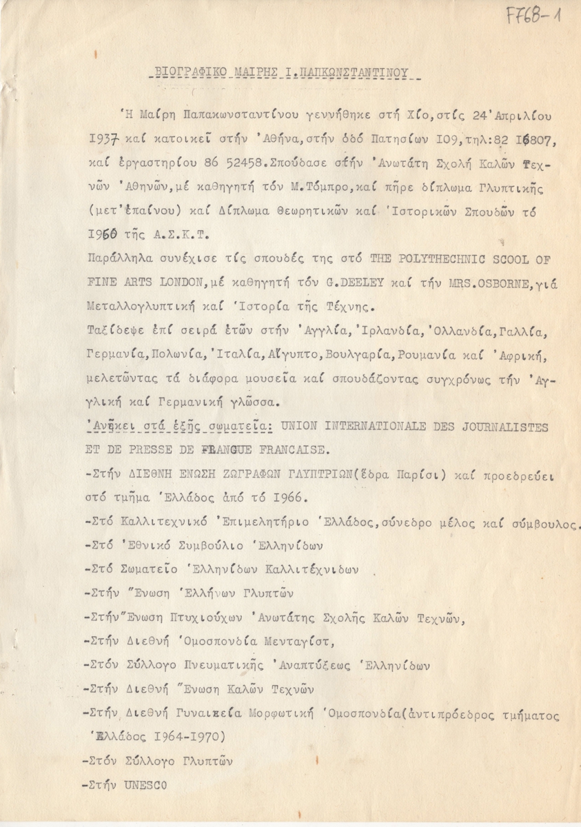 Βιογραφικό, δακτυλόγραφο, χαρτί, 11 φφ, 30×21 εκ., στα ελληνικά, της Μαίρης Παπακωνσταντίνου. Περιέχει καλλιτεχνική δραστηριότητα, διαλέξεις, συνέδρια, έργογραφία, μνημεία, βραβεία, τιμητικά διπλώματα, εκθέσεις.