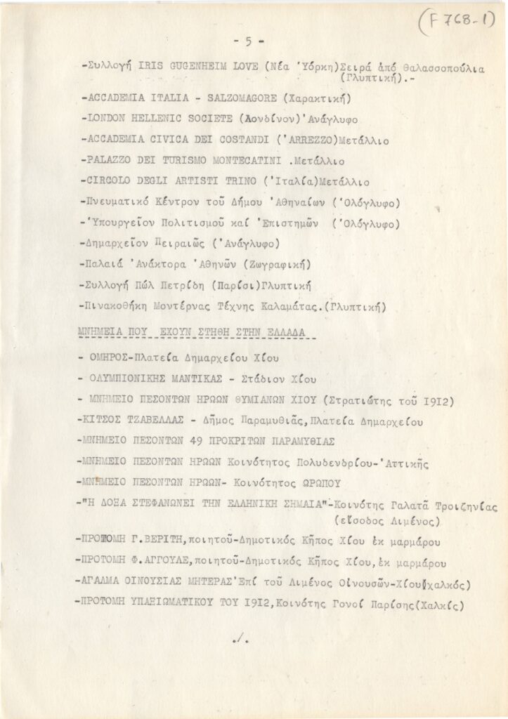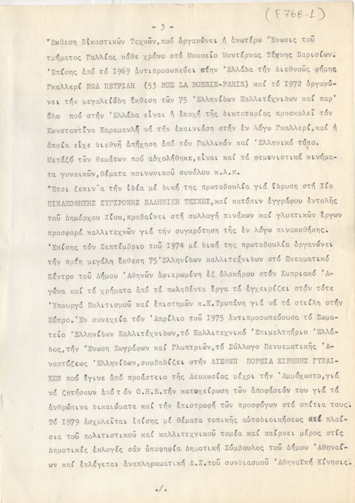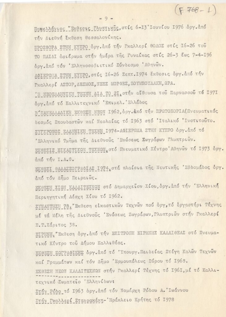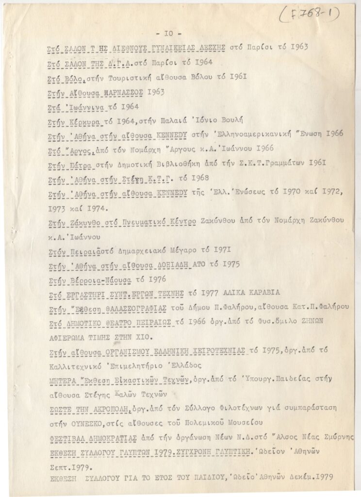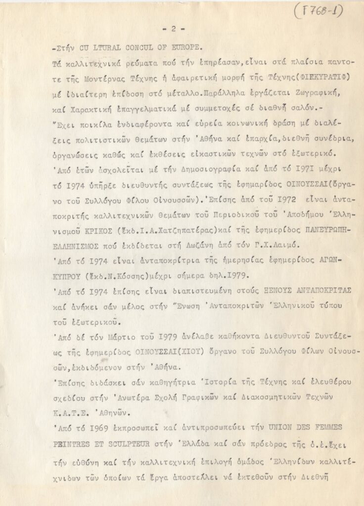 Βιογραφικό, δακτυλόγραφο, χαρτί, 11 φφ, 30×21 εκ., στα ελληνικά, της Μαίρης Παπακωνσταντίνου. Περιέχει καλλιτεχνική δραστηριότητα, διαλέξεις, συνέδρια, έργογραφία, μνημεία, βραβεία, τιμητικά διπλώματα, εκθέσεις.
