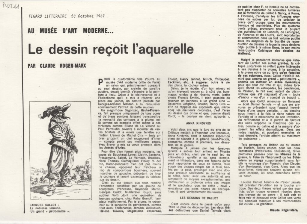 Φωτοαντίγραφο, χαρτί, 21×29 εκ., στα γαλλικά, δημοσίευσης κριτικής εκθέσεων των Άννας Κινδύνη και Jacques Callot. Επίσης, γίνεται λόγος για το Μουσείο Μοντέρνας Τέχνης στο Παρίσι και τα έργα που φιλοξενεί.