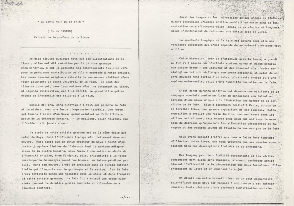 Φωτοαντίγραφο, χαρτί, 21×29 εκ., στα γαλλικά, προλόγου βιβλίου, στο οποίο επιμελήθηκε την εικονογράφηση η Άννα Κινδύνη. Δίνονται πληροφορίες για το έργο και το στυλ της καλλιτέχνιδας.